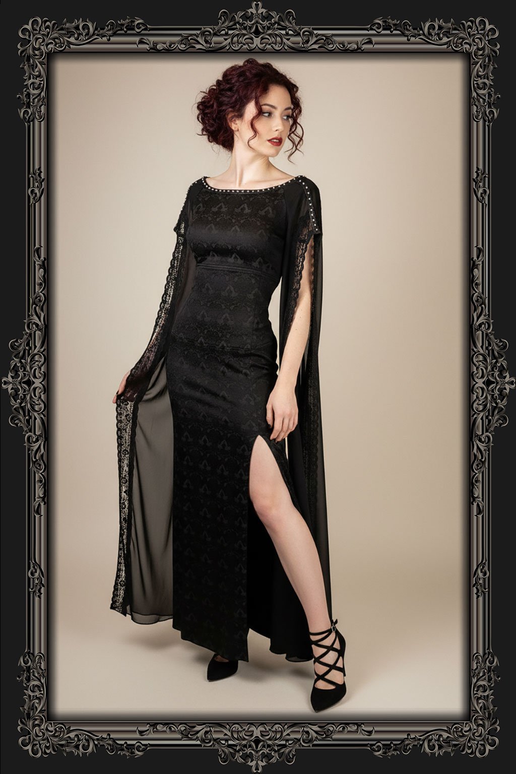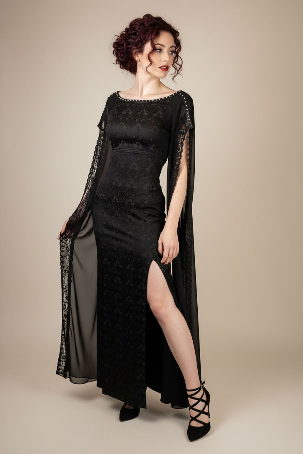 Black Cathedral jsou dlouhé černé společenské šaty z brokátu se širokým dekoltem, stříbrnými kovovými peckami kolem výstřihu a živůtkem se šněrovačkou na zádech, vyrobené pouze v jednom jediném kuse. Mají rovnou sukni s rozparkem na levém stehně a extra dlouhé lehké šifonové rukávy až na zem, lemované krajkou.