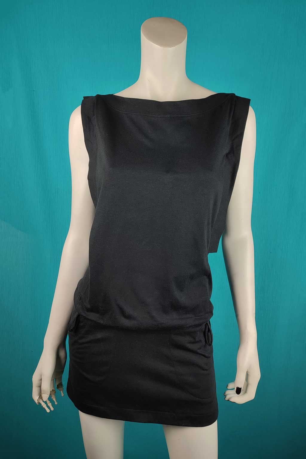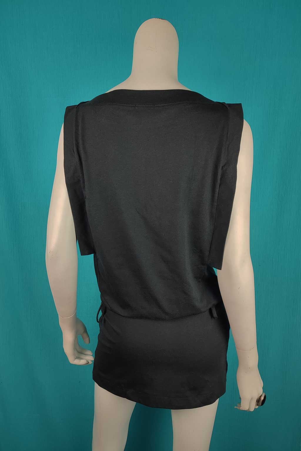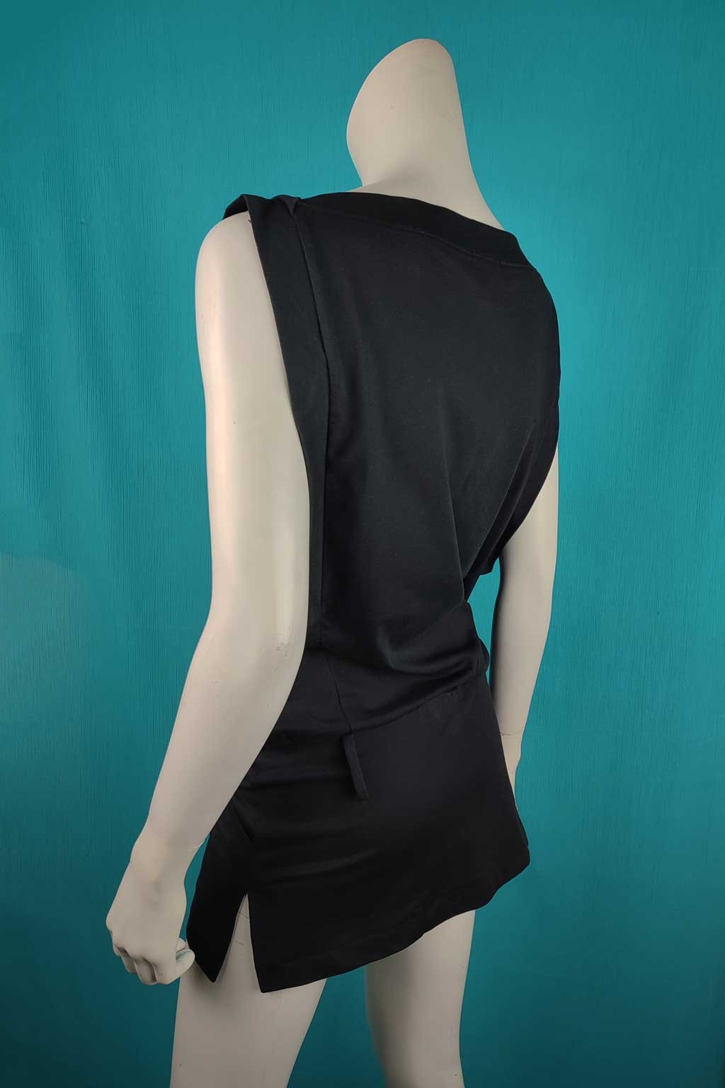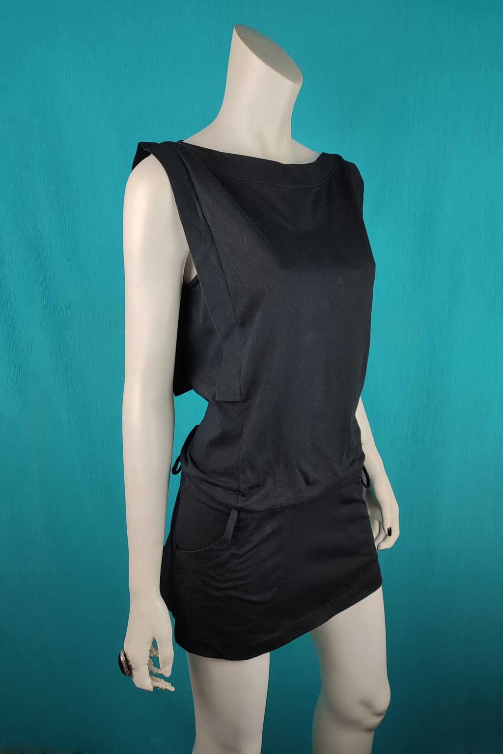 Minimalistická černá tunika z příjemné bavlny pro každodenní nošení i večerní výstup. Lodičkový výstřih zvýrazní klíční kosti, skrytá guma pod pasem jemně formuje siluetu a ozdobná poutka zvou k doplnění vaším oblíbeným páskem (pásek není součástí). Boční rozparky pro volnost pohybu a dvě praktické kapsy na předním díle. Volná přes břicho, přiléhavá přes boky – schová bříško, zvýrazní zadeček.