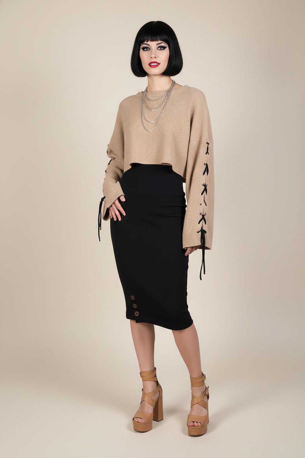 Představujeme vám elegantní černou pouzdrovou sukni s délkou pod kolena, která je ideální volbou pro každou příležitost. Sukně je navržena s vysokým pasem, který sahá až pod prsa, což vytváří krásnou siluetu a opticky prodlužuje postavu. Malý ozdobný rozparek je zdoben řadou stříbrných knoflíků, které dodávají sukni sofistikovaný vzhled. Elastický a pohodlný materiál zaručuje maximální komfort při nošení, zatímco jeho vysoká kvalita zajišťuje dlouhou životnost. Tato sukně je perfektní volbou k volným crop topům, se kterými vytvoříte stylový a moderní outfit.