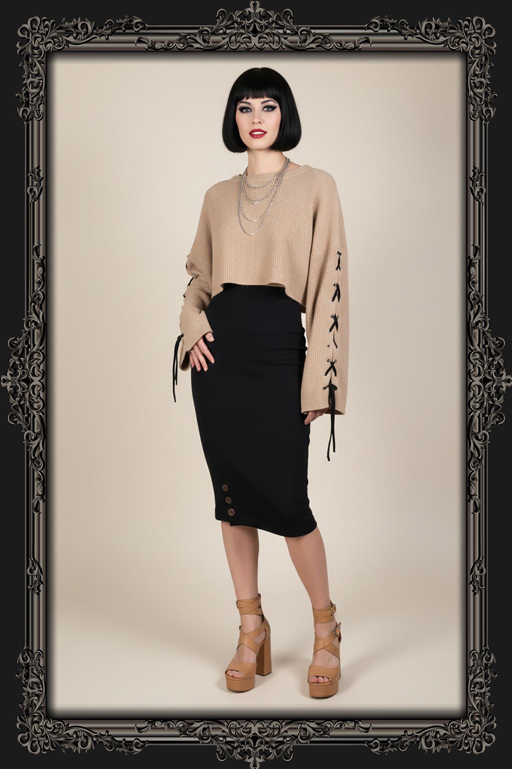 Hledáte kousek, který dodá vašemu šatníku špetku elegance a stylu? Naše černá pouzdrová sukně s délkou pod kolena je přesně to, co potřebujete! S vysokým pasem, který lichotí každé postavě, a ozdobným rozparkem se stříbrnými knoflíky, se stane středobodem vašeho outfitu. Vyrobena z elastického a pohodlného materiálu, je ideální pro celodenní nošení. Kombinujte ji s volnými crop topy pro moderní a trendy vzhled. Nechte se unést jejím nadčasovým designem a objevte nekonečné možnosti, jak ji nosit!