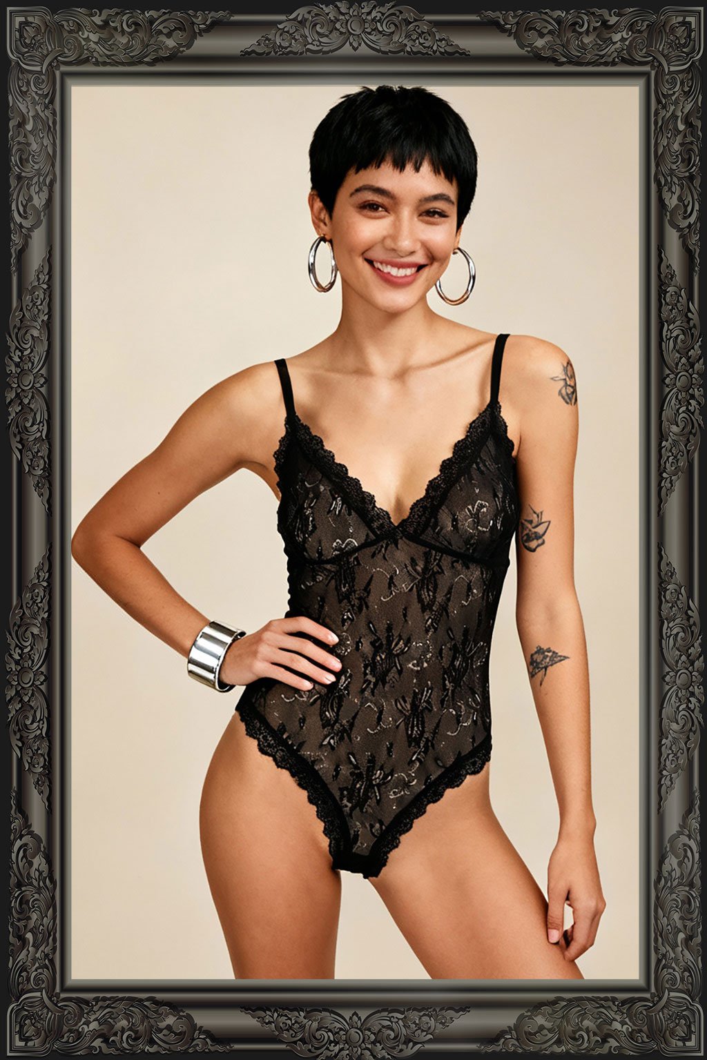 Ponořte se do elegance s naším černým krajkovým body, které je ztělesněním italské krásy a sofistikovanosti. Elastická krajka jemně obepíná tělo a vytváří svůdný siluetu, zatímco nastavitelná ramínka zajišťují, že vám body padne přesně tak, jak potřebujete. Praktické zapínání na patenty v kroku usnadňuje oblékání. Tento kousek je ideální pro ty, kteří hledají dokonalou kombinaci luxusu a pohodlí. Přidejte do svého šatníku nádech italského šarmu!