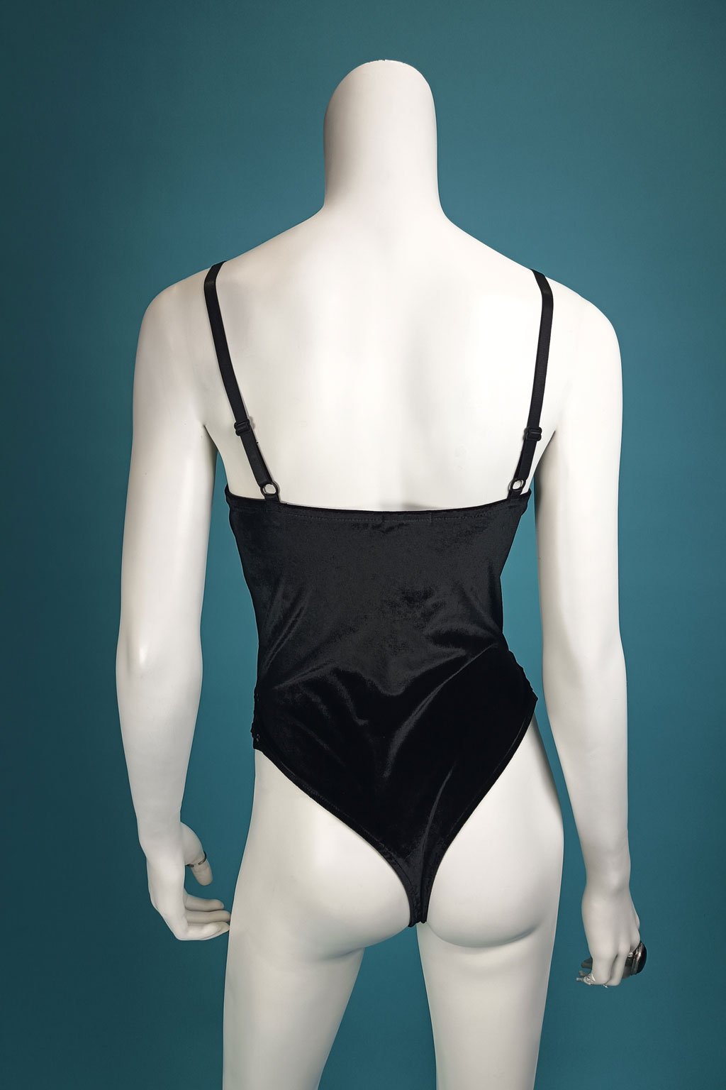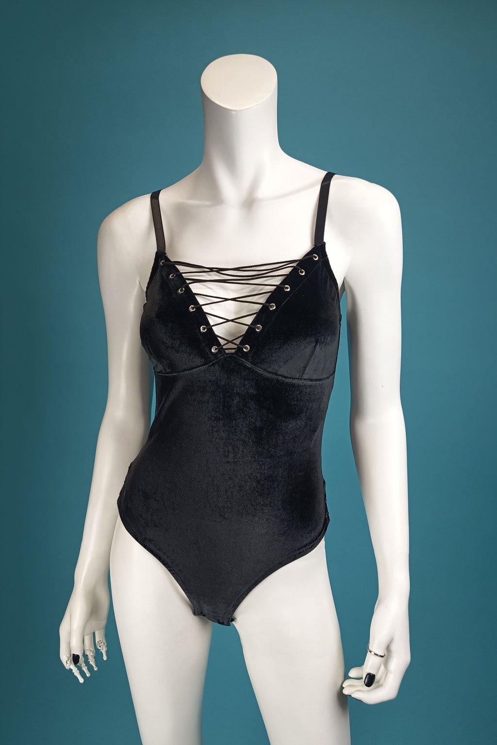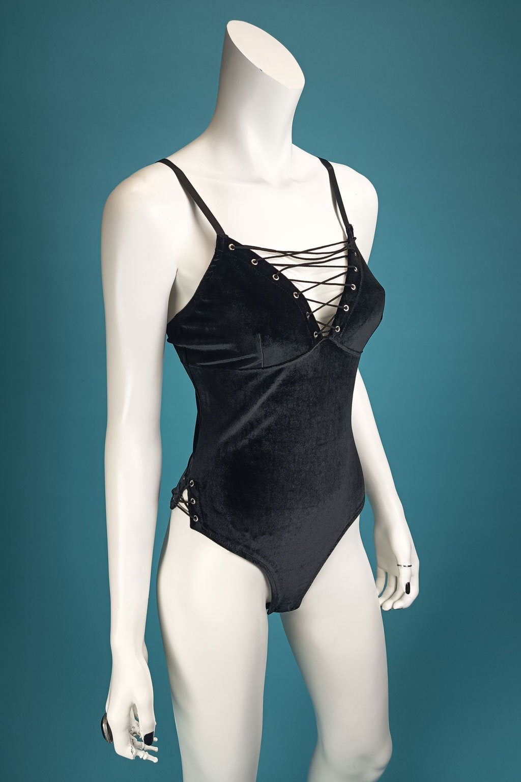 Elegantní černé sametové body, které spojuje šarm a moderní design. Toto body je zdobené šněrováním ve výstřihu a na bocích, což mu dodává pikantní a elegantní vzhled. Zapínání na patenty v dolní části a nastavitelná ramínka zajišťují pohodlné nošení a individuální nastavení.