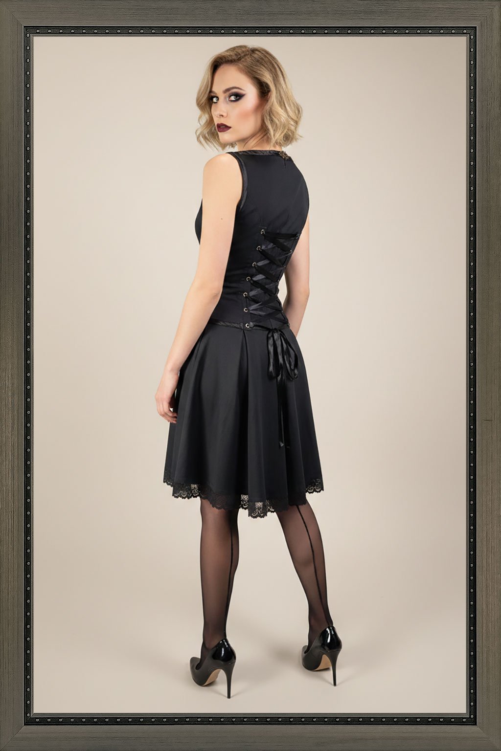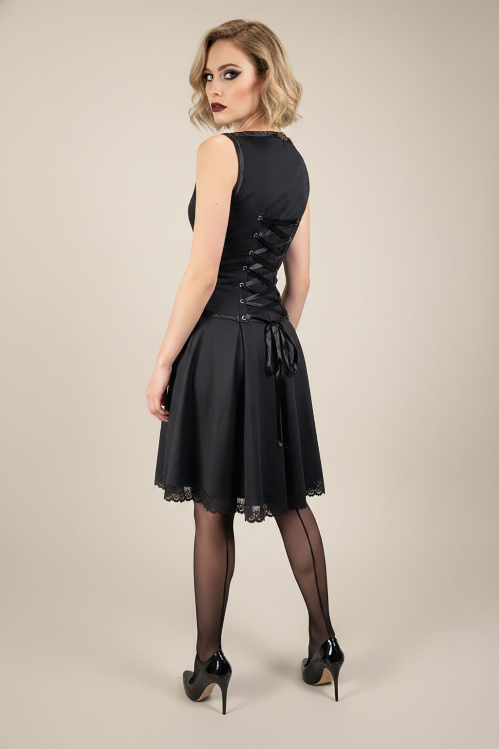 Elegantní černé šaty se šněrováním na zádech. Šněrování na zadní straně šatů přidává do designu nejen romantiku, ale také možnost přizpůsobit šaty své postavě. Každý šněrovací detail je precizně zpracován, abyste mohli dosáhnout dokonalé siluety. Jsou velmi ženské, zvýrazní pas a detaily na zádech působí rafinovaně a velmi sexy. Vhodné jsou jak na každodenní nošení, tak na společenské příležitosti. Jsou velmi pohodlné. Pod šněrováním je zapínání na skrytý zip, aby se daly pohodlně obléct a v bočních švech mají kapsy. Vyrábíme je z pevnějšího elastického přírodního materiálu.