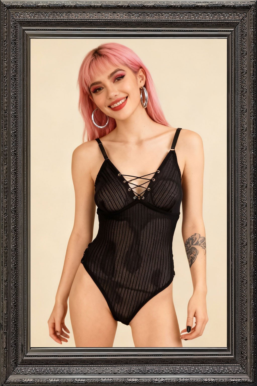 Elegantní černé body střihu Zoe, které spojuje šarm a moderní design. Toto body je zdobené šněrováním ve výstřihu a na bocích, což mu dodává pikantní a elegantní vzhled. Zapínání na patenty v dolní části a nastavitelná ramínka zajišťují pohodlné nošení a individuální nastavení.