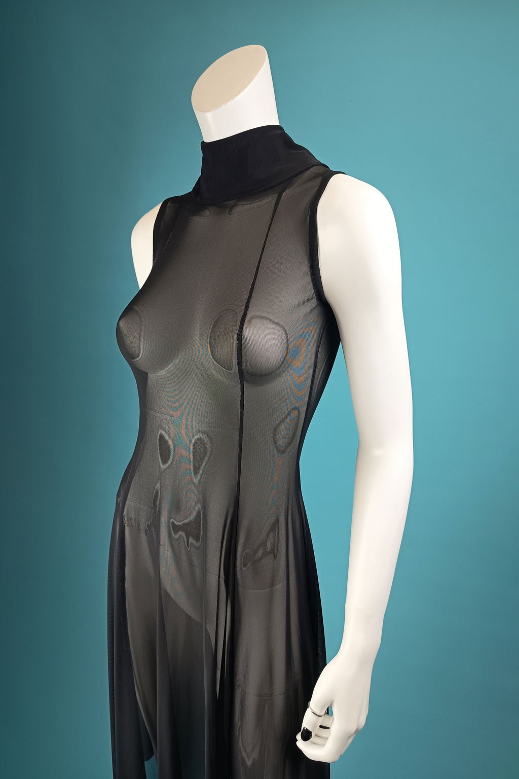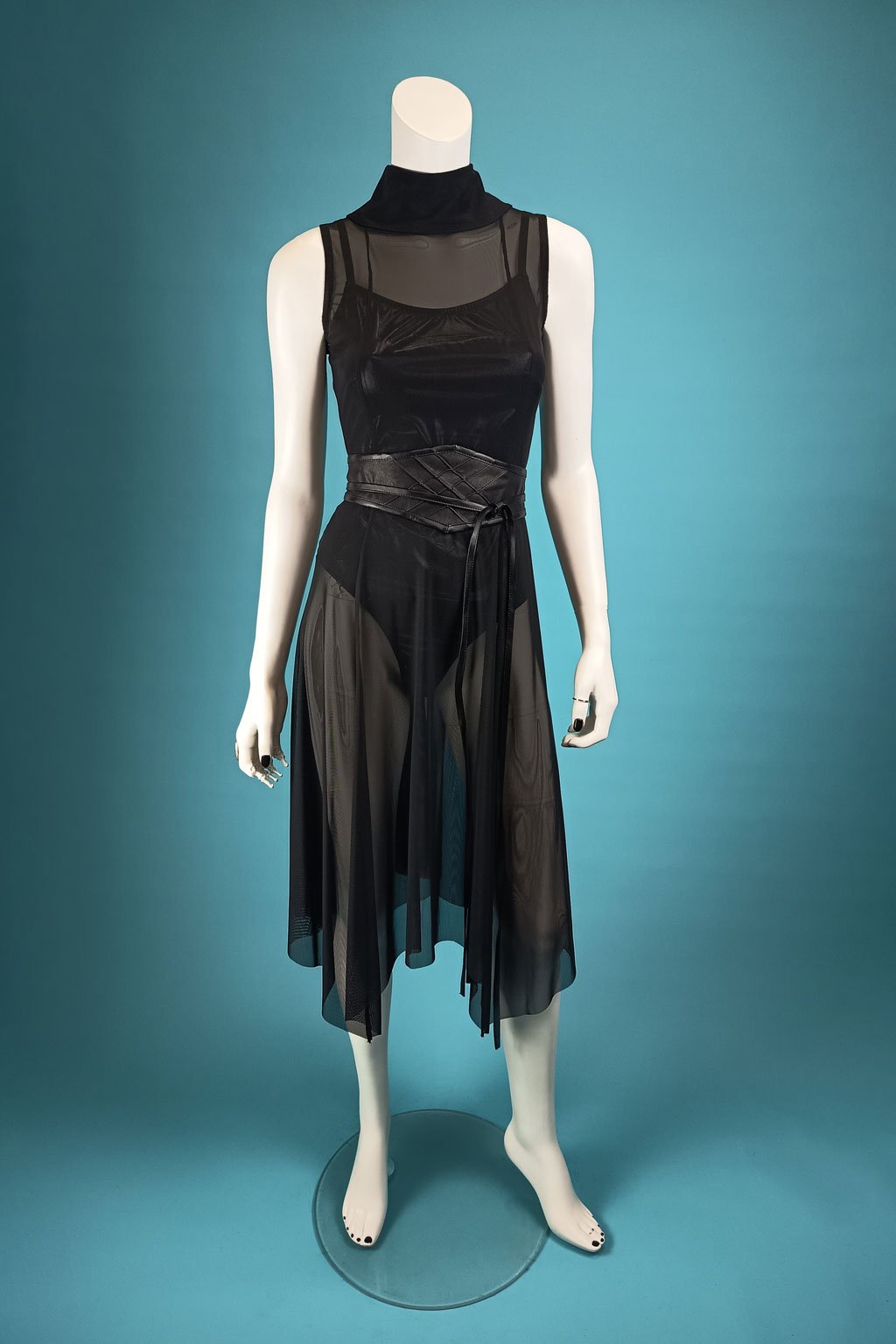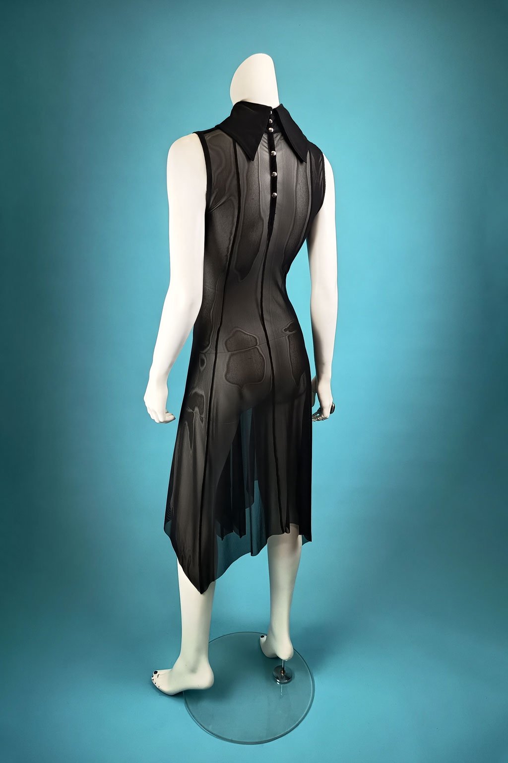 Představujeme vám černé tylové šaty s vysokým límcem, které zaujmou svou elegancí a sofistikovaným designem. Šaty mají légu zapínanou na stříbrné patenty v zadním díle, což přidává moderní a stylový prvek. Průběžné švy a široká sukně s cípy dodávají šatům jedinečný a dramatický vzhled. Tyto ručně vyrobené šaty jsou zpracovány s absolutní precizností, což zajišťuje jejich vysokou kvalitu a jedinečnost.