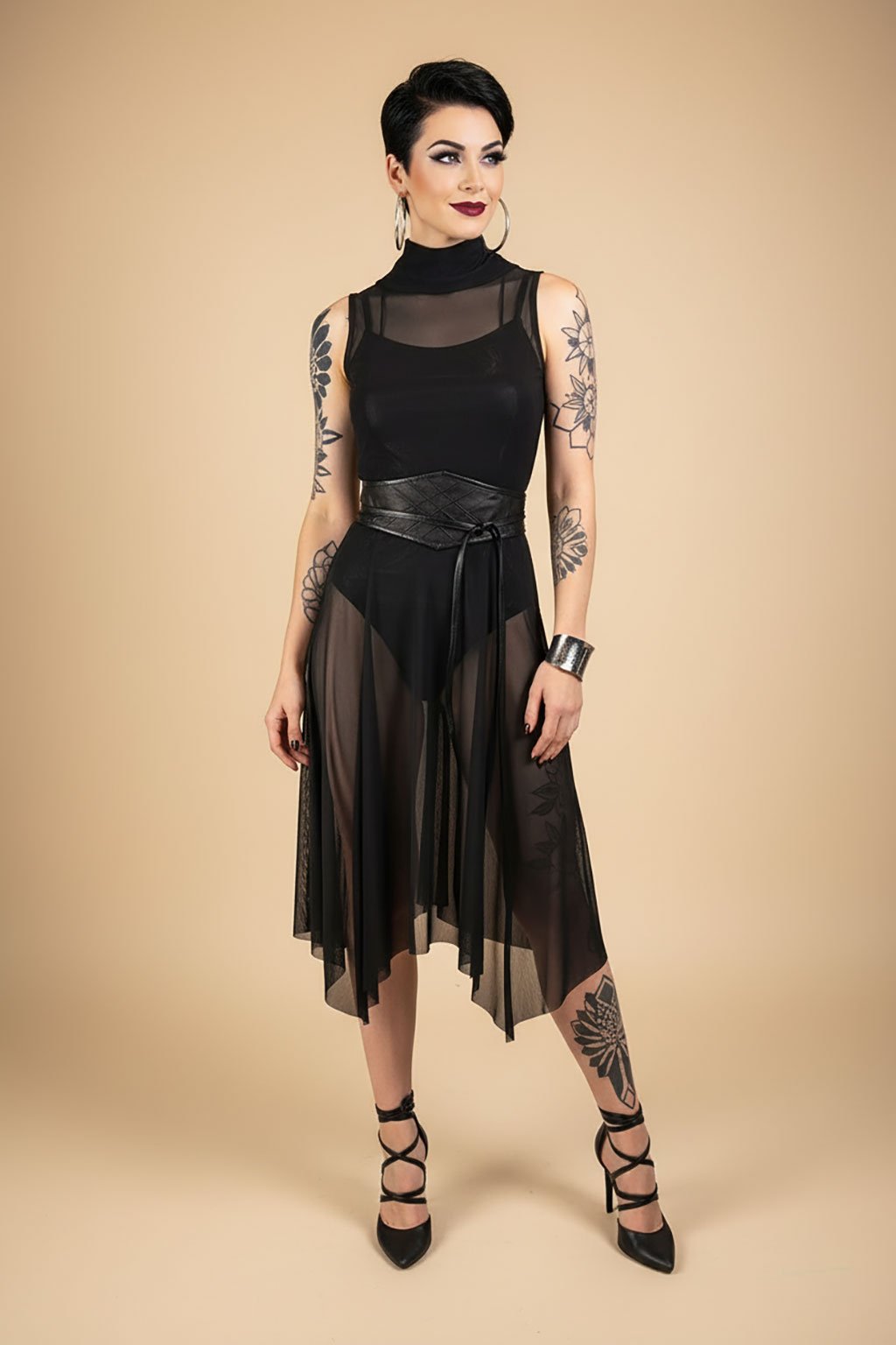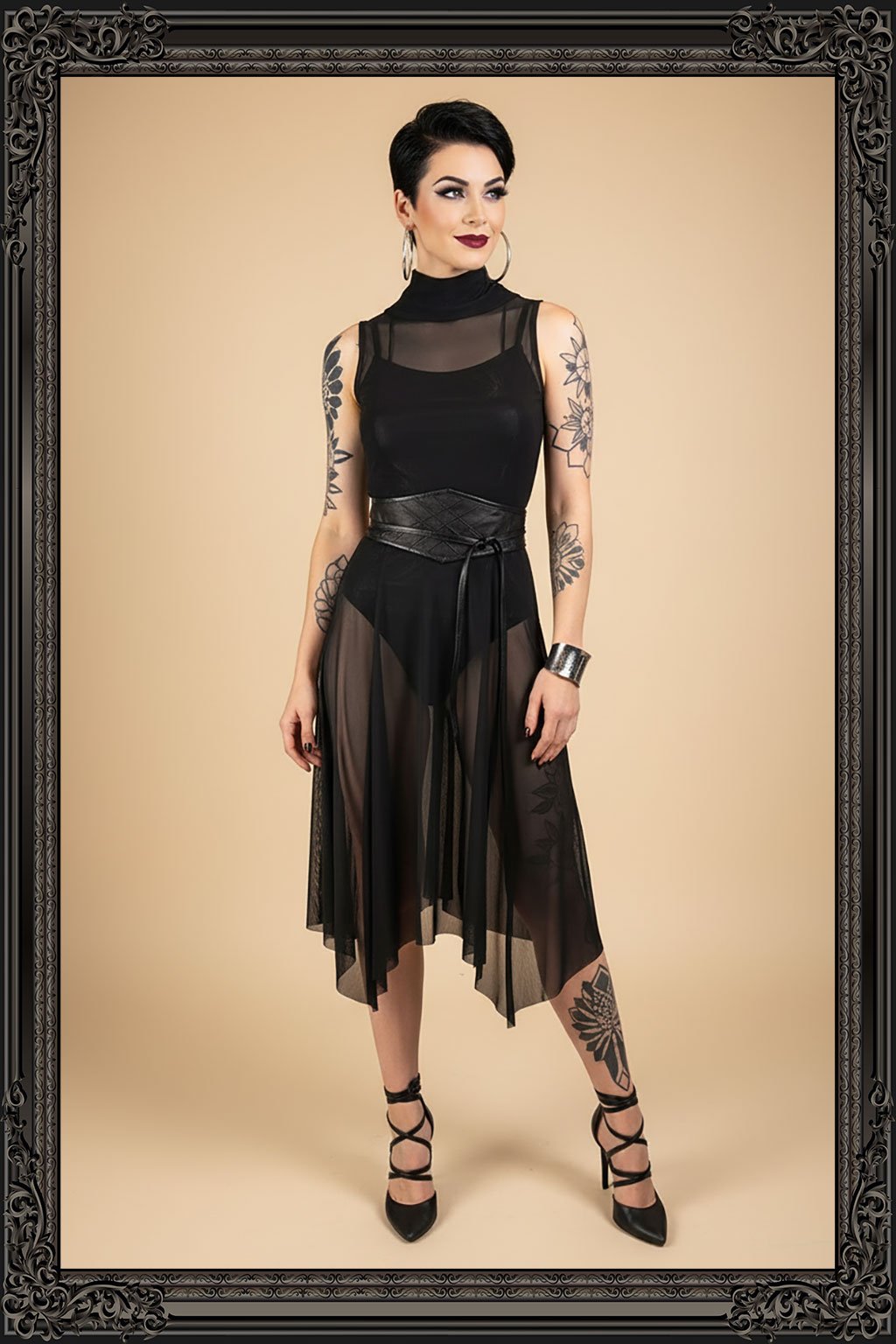 Vstupte do světa elegance a stylu s našimi černými tylovými šaty, které jsou dokonalým příkladem mistrovské ruční práce. Vysoký límec a léga zapínaná na stříbrné patenty na zadním díle dodávají šatům moderní a sofistikovaný nádech. Průběžné švy a široká sukně s cípy vytvářejí dramatickou siluetu, která vás nechá vyniknout v každé situaci. Tyto šaty, vyrobené s naprostou precizností, jsou ideální volbou pro každou příležitost, kdy chcete vypadat elegantně a cítit se sebevědomě. Přidejte tyto výjimečné šaty do svého šatníku a nechte se okouzlit jejich krásou a kvalitou.
