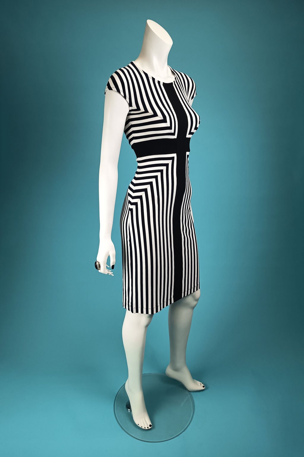 Elegantní pruhované šaty střihu Aranei, které vynikají svým jedinečným designem. Tyto šaty jsou ručně sesazené do originálního motivu kříže, což jim dodává sofistikovaný a moderní vzhled. Precizní ruční práce zaručuje, že každý kus je unikátní a pečlivě zpracovaný. Pruhovaný vzor v kombinaci s motivem kříže vytváří zajímavou vizuální dynamiku, která přitahuje pozornost a dodává šatům exkluzivní charakter.