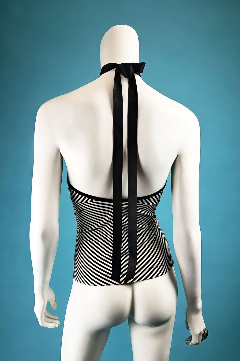Představujeme vám elegantní tílko s jemným proužkem, které je ručně sesazené do atraktivního motivu kosočtverce na předním díle. Toto tílko je výsledkem precizní ruční práce, která zaručuje jedinečnost a vysokou kvalitu každého kousku. Navrženo s hlubokým výstřihem na zádech, tílko se zavazuje na dlouhou stuhu kolem krku, což přidává sofistikovaný a romantický prvek. Vyrobeno z vysoce kvalitního elastického materiálu, který zajišťuje pohodlí a perfektní přizpůsobení postavě.