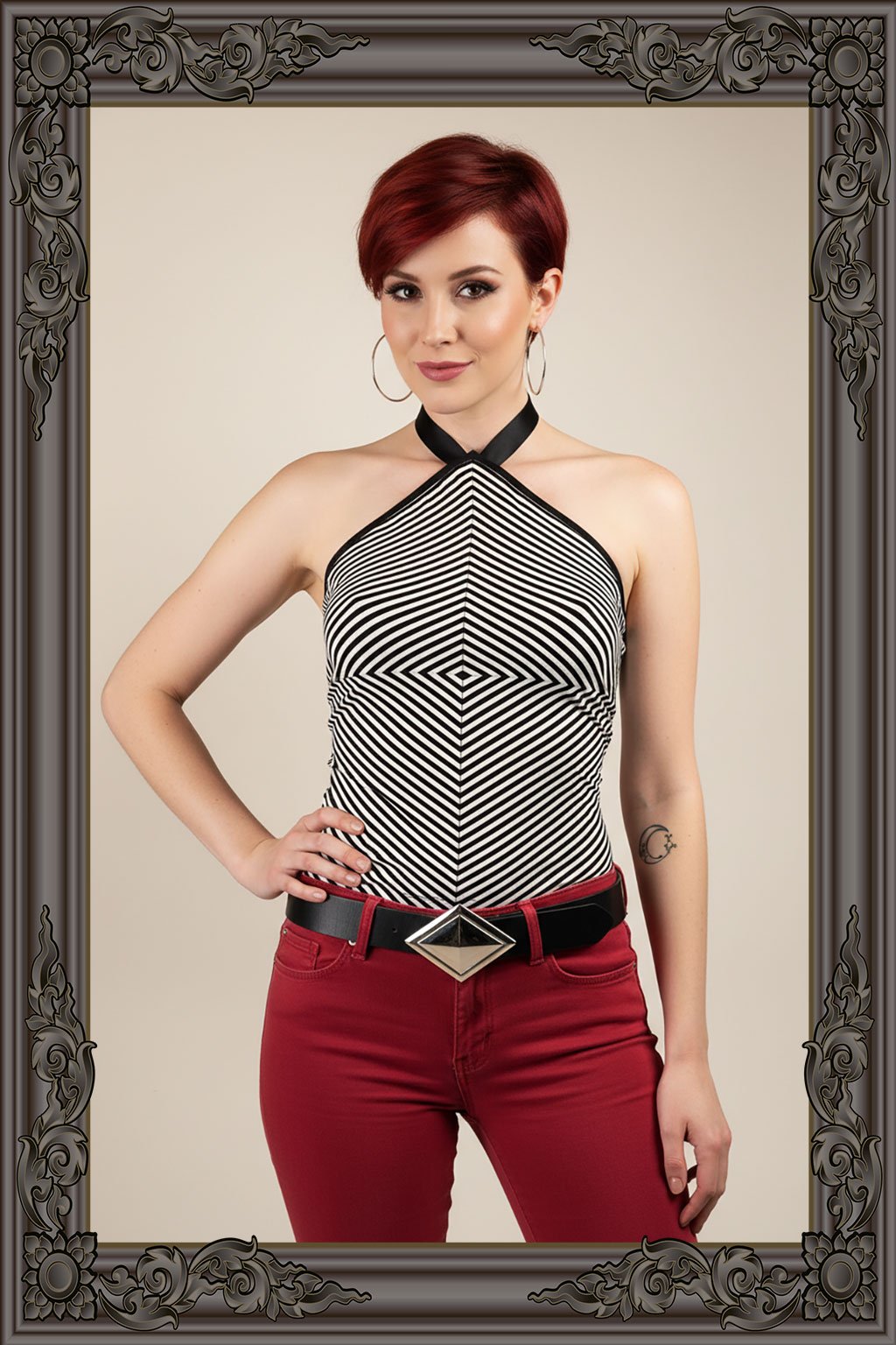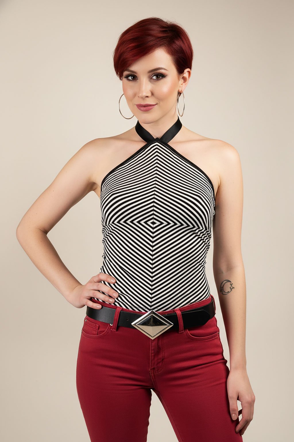 Zažijte dokonalou kombinaci stylu a komfortu s naším tílkem, které vás okouzlí jemným proužkem a ručně sesazeným motivem kosočtverce. Precizní ruční práce zaručuje, že každý kus je unikátní a vysoce kvalitní. Hluboký výstřih na zádech a zavazování na dlouhou stuhu kolem krku dodávají tílku elegantní vzhled a přitažlivost. Elastický materiál zajišťuje, že se tílko dokonale přizpůsobí vaší postavě a poskytne maximální pohodlí. Ideální volba pro každou příležitost, kdy chcete vypadat stylově a cítit se sebevědomě. Přidejte toto jedinečné tílko do svého šatníku a nechte se unést jeho krásou a kvalitou.