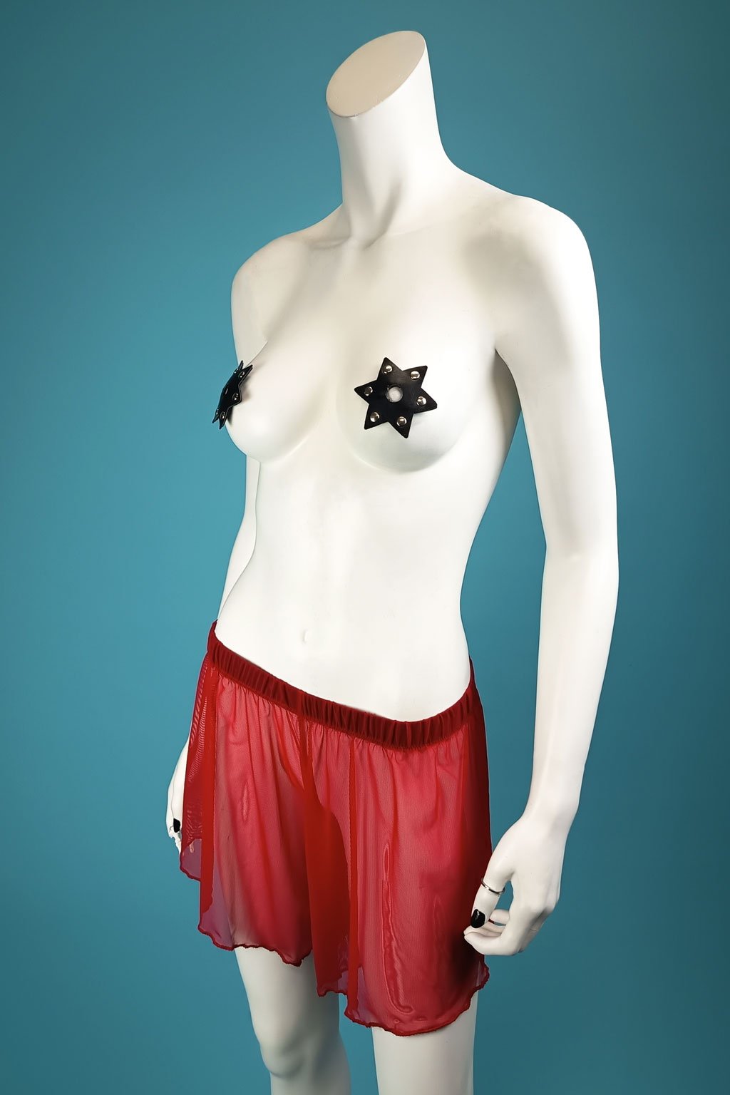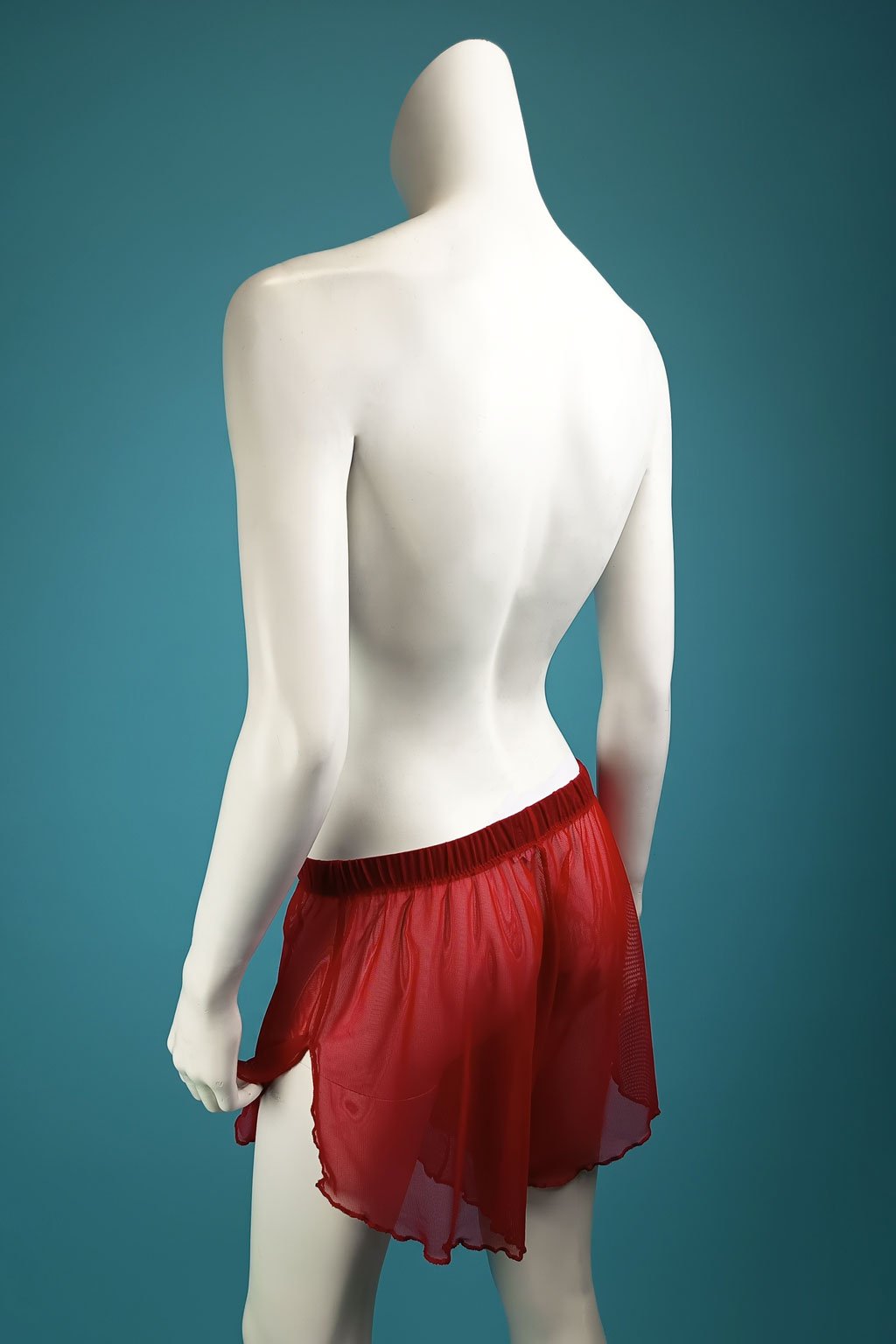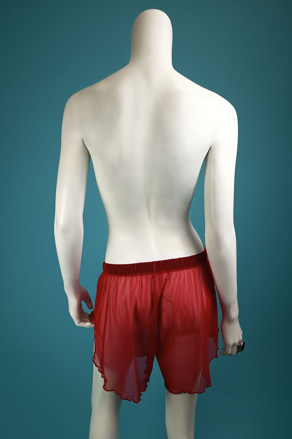 Kraťasy mají volný střih, který zajišťuje maximální pohodlí a volnost pohybu. Vysoké rozparky na bocích přidávají do designu lehkost a vzdušnost, zároveň umožňující výrazné prozrazení nohou. Tento prvek a transparentní materiál dodávají kraťasům moderní a velmi svůdný nádech.