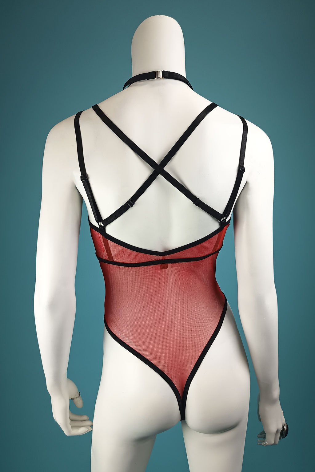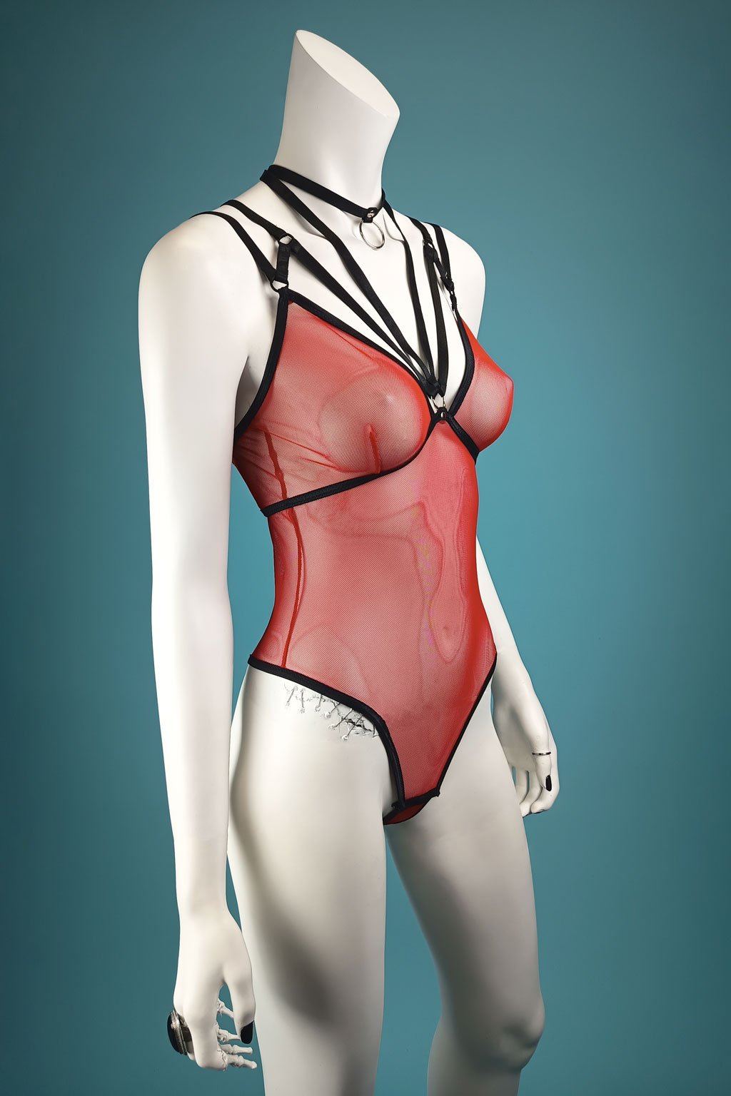Tohle červené tylové body je přesně ten kousek, který vypadá jemně na první pohled, ale má v sobě jasnou dávku drzosti. Transparentní tyl nechá pokožku decentně prosvítat, černé lemování zvýrazní linie těla a harness prvky v dekoltu přidají ten správný „zakázaný“ detail, který přitahuje pohled a nepustí.