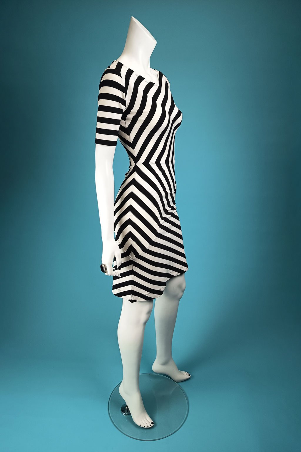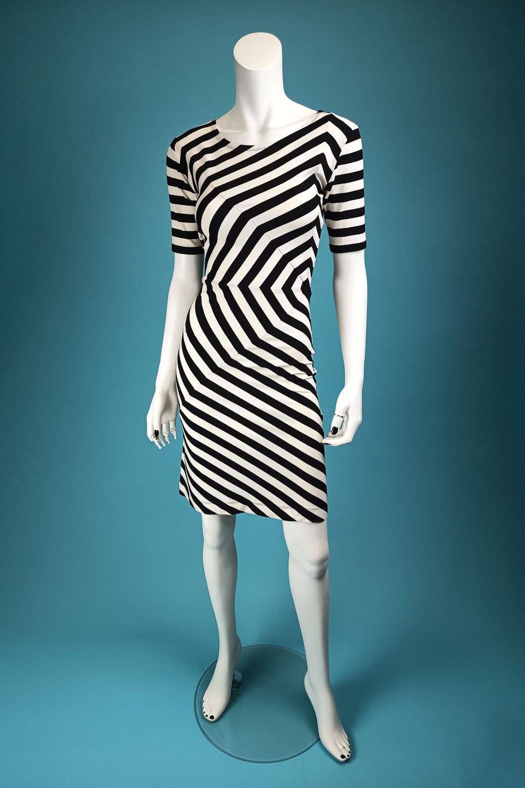 Délka a střih šatů jsou navrženy tak, aby podtrhovaly ženskou siluetu a zajišťovaly elegantní vzhled. Pruhovaný vzor opticky tvaruje postavu a dodává ženskost každému pohybu.