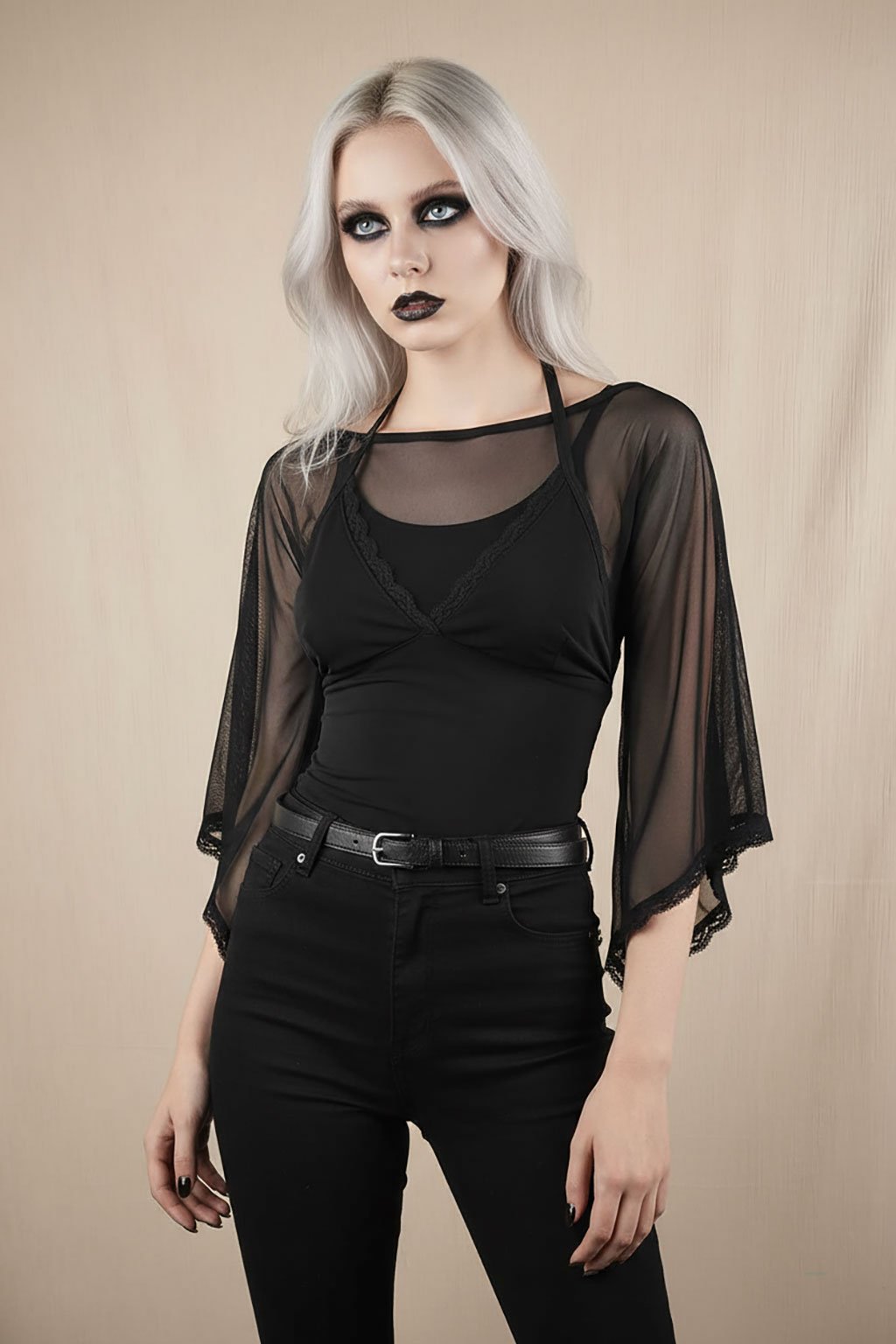 Tato halenka v gotickém stylu je ideální pro ty, kteří mají rádi temné a tajemné outfity. Tylové zvonové rukávy s cípy dodávají halence unikátní a dramatický vzhled. Krajkové detaily na halence přidávají celému mystickému nádechu. Vrchní část halenky je vyrobena z kvalitního elastického tylu, který je pohodlný na nošení a zároveň vytváří efektní kontrasty s ostatními materiály.