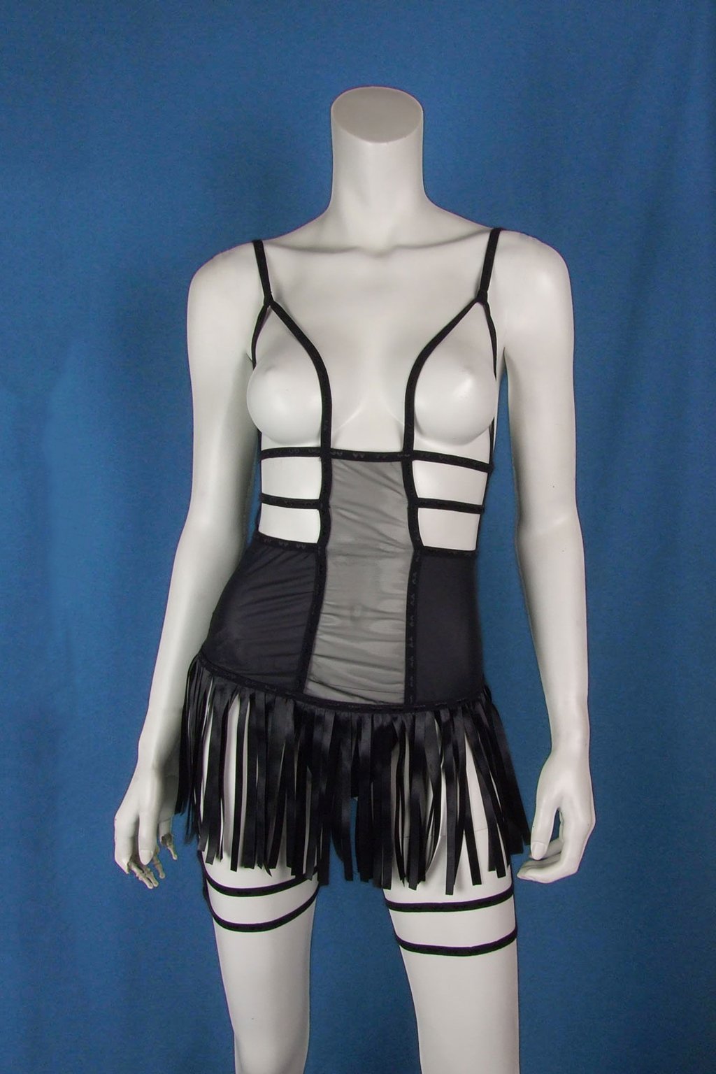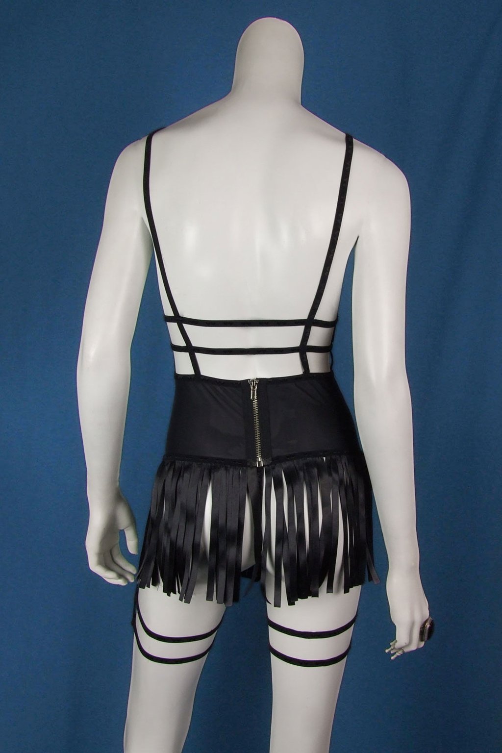 Grafická harness konstrukce smyslně vykreslí siluetu a otevřený top dodá odvážný akcent. Pasové půlené kalhotky ve střihu tanga, zakryté pohyblivými třásněmi, rafinovaně pracují s mírou odhalení. Ozdobný stříbrný zip na zádech působí jako šperk a podtrhuje čisté linie modelu. Precizní ruční práce zaručuje pevné spoje, čisté zakončení a komfort při nošení.
