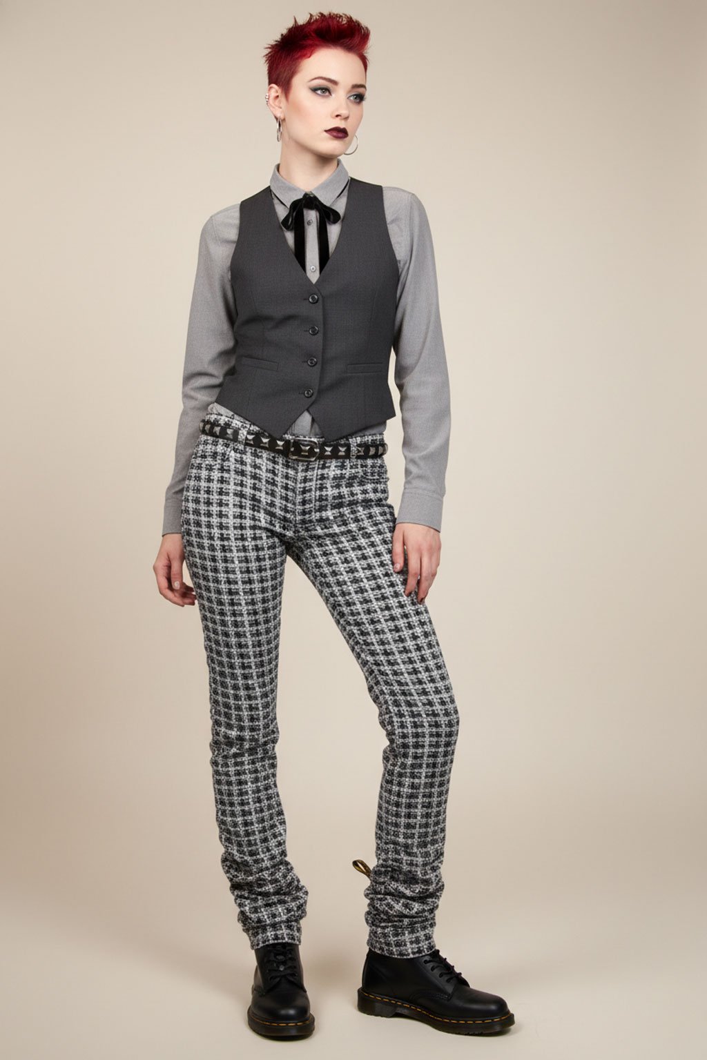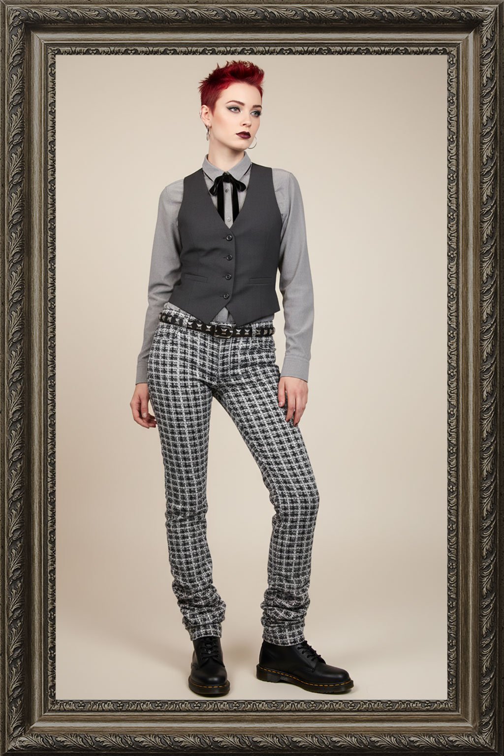 Šedé kostkované kalhoty s řasenými nohavicemi ve velikosti 40. Vyrobený je pouze jeden kus. Bokové kalhoty z mírně elastického příjemného materiálu. Zapínají se ve středu předního dílu. Na předním díle jsou kapsy. Zadní díl má sedlo. Nohavice jsou mírně rozšířené.
