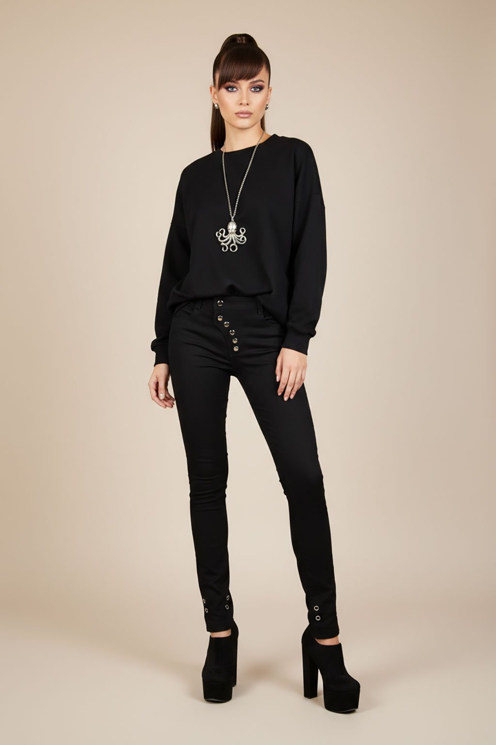 Černé elastické kalhoty s šikmým zapínáním na řadu stříbrných druků.. Díky pružnému materiálu jsou velmi pohodlné, vyrábíme je z kvalitní velmi pružné rifloviny. Můžete si je objednat v dlouhé verzi s rozparky nebo v 7/8 délce.