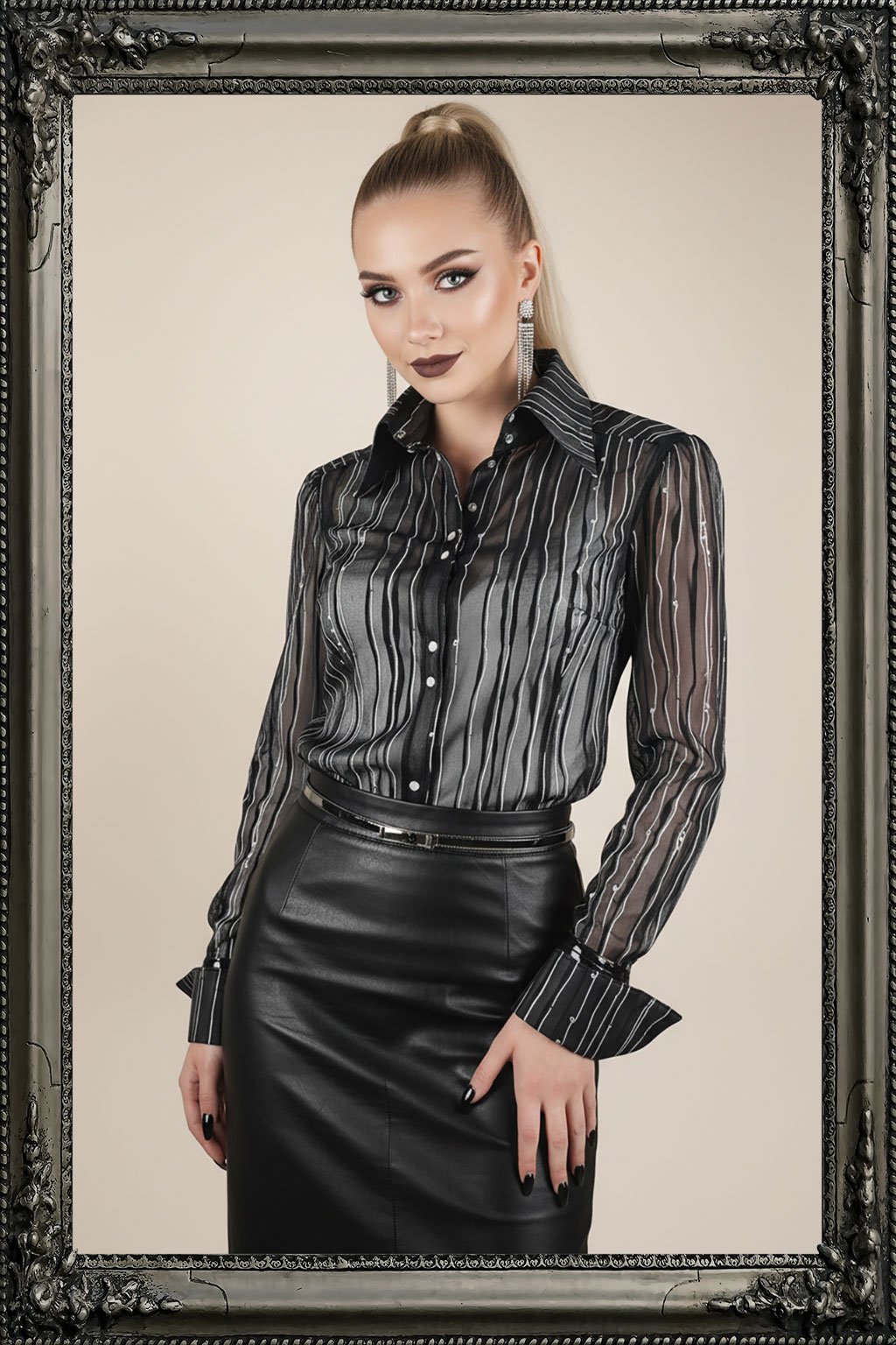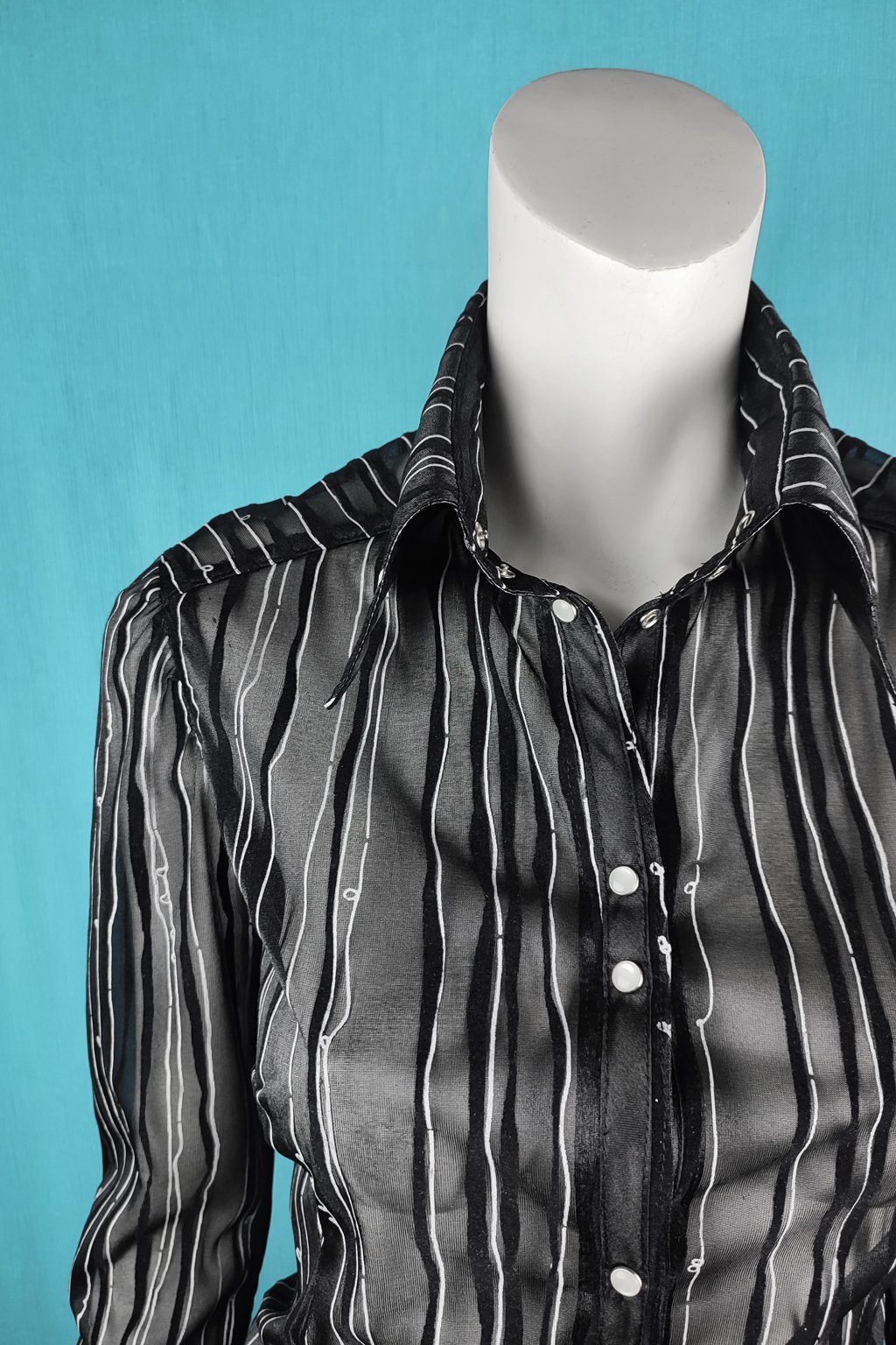 Elegantní košile zapínaná na patenty. Vyrobená s mírně transparentního elastického materiálu s potiskem nepravidelných černých a bílých pruhů. Vysoký límec a manžety jsou ze spodní strany z lakovaného materiálu. Perte šetrně, nežehlete.