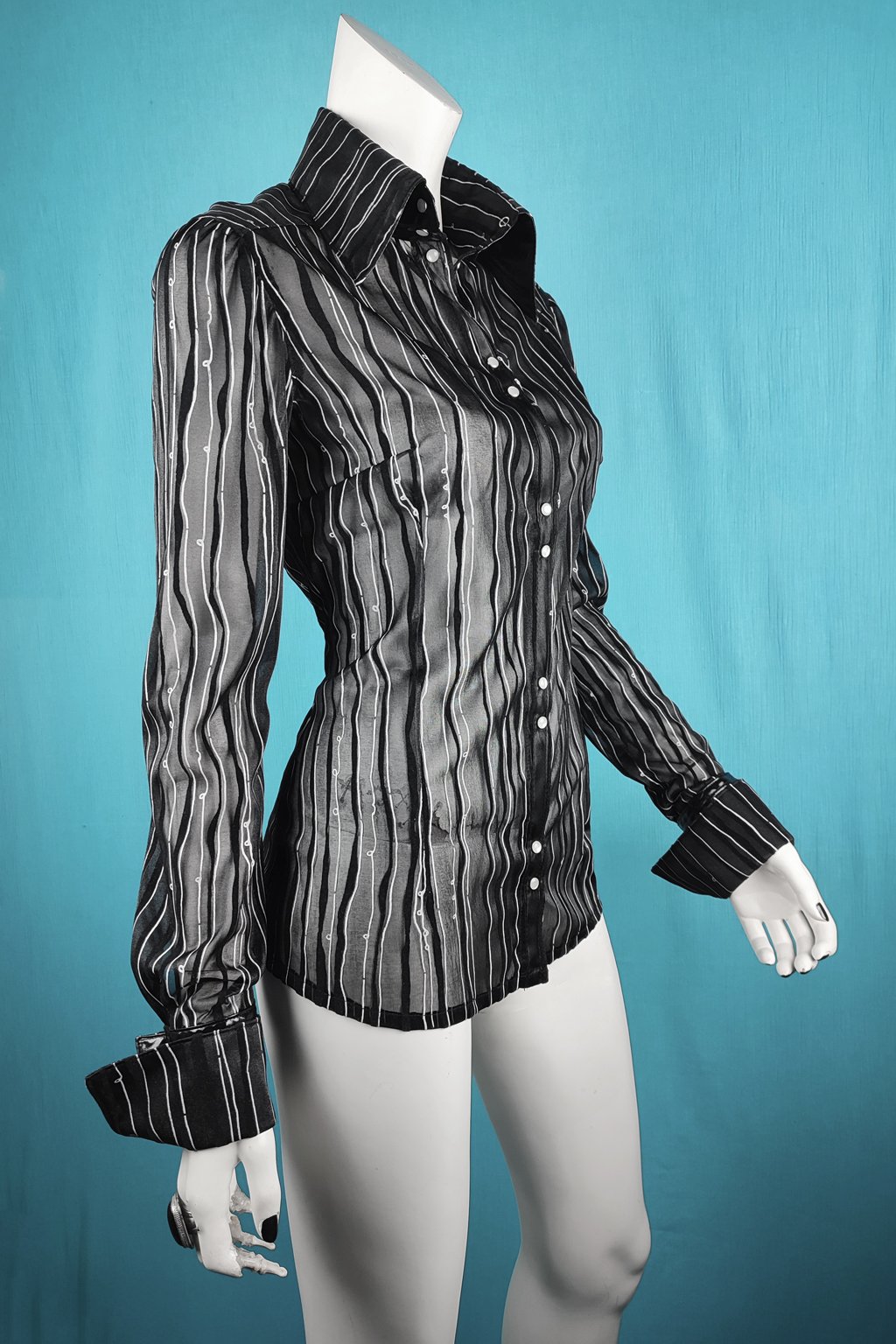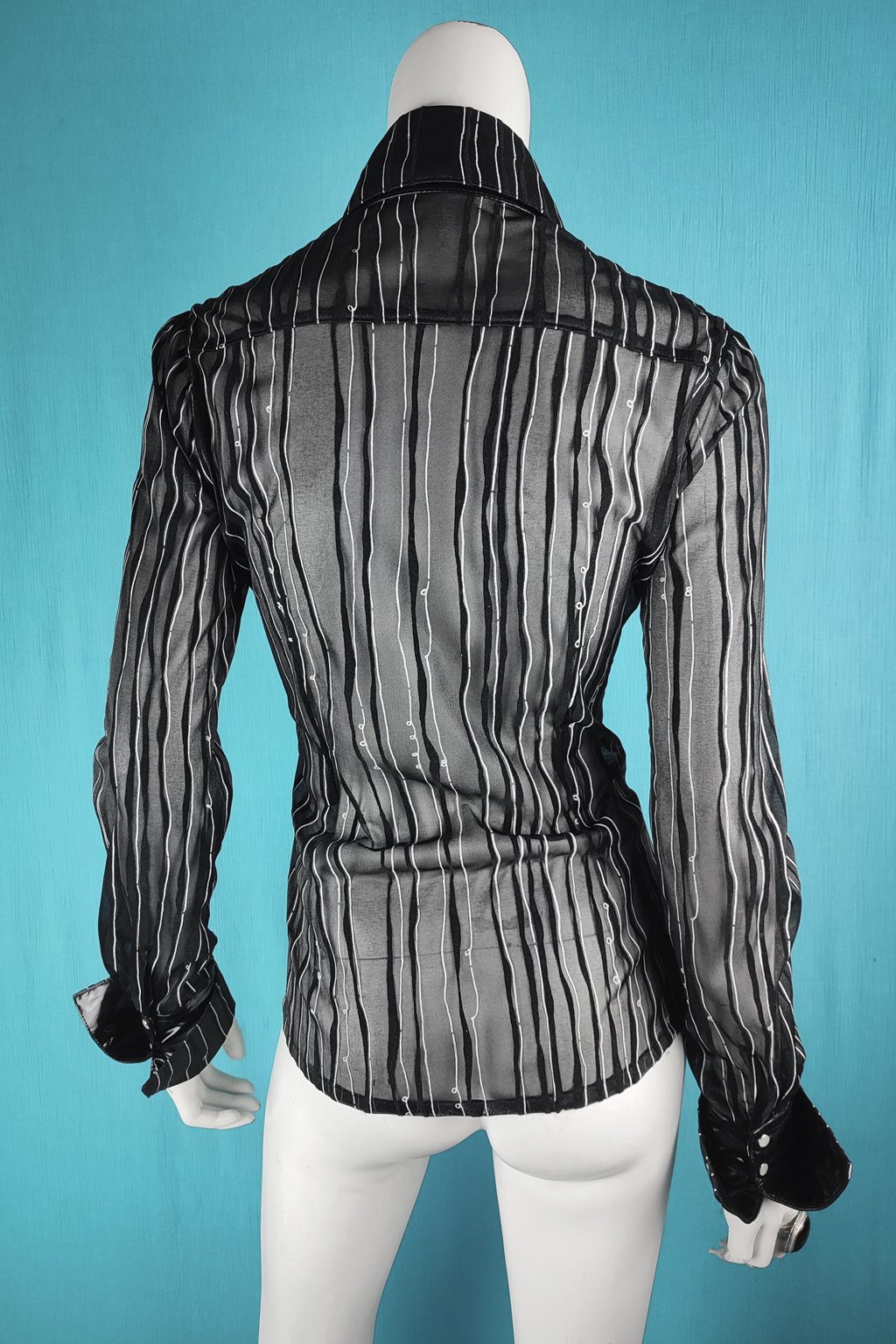 Elegantní košile zapínaná na patenty. Vyrobená s mírně transparentního elastického materiálu s potiskem nepravidelných černých a bílých pruhů. Vysoký límec a manžety jsou ze spodní strany z lakovaného materiálu. Vyrobené pouze tři kusy ve velikosti 38, 40 a 42.