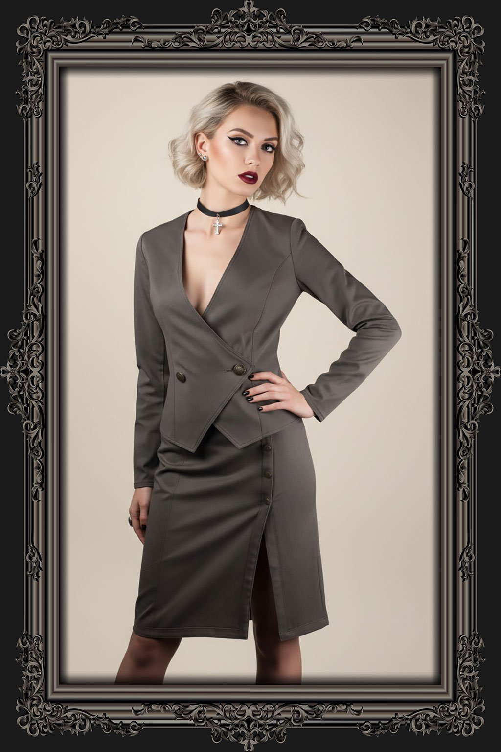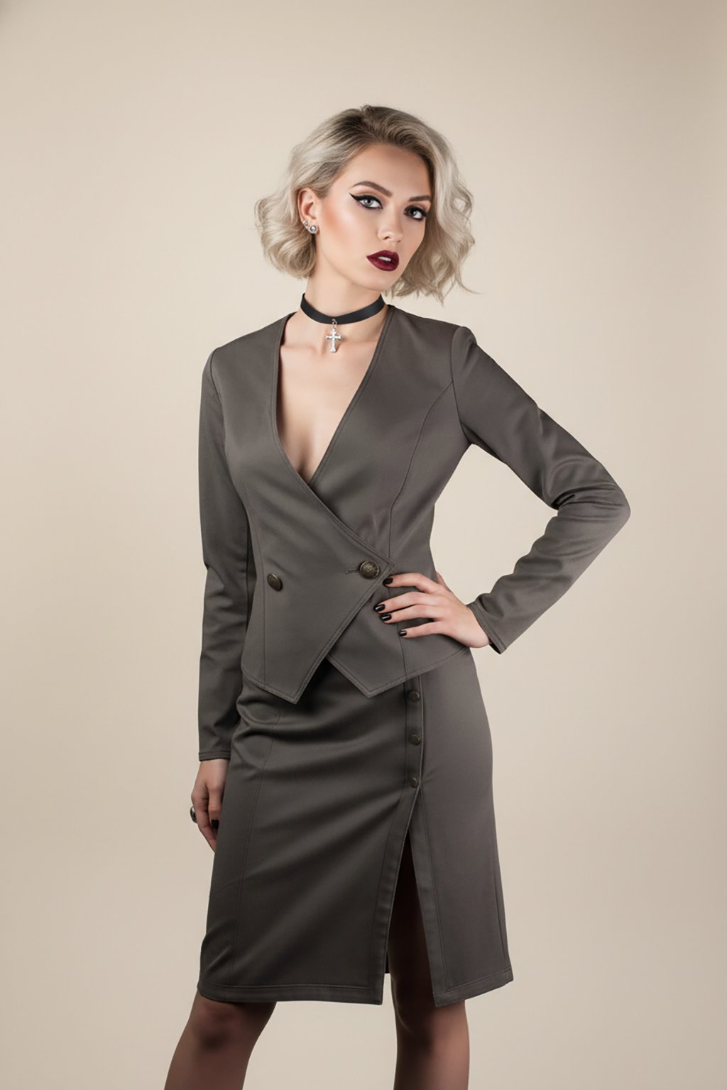 Dvouřadové sako a sukně zapínaná na řasu patentů. Obojí je nepodšívkované.