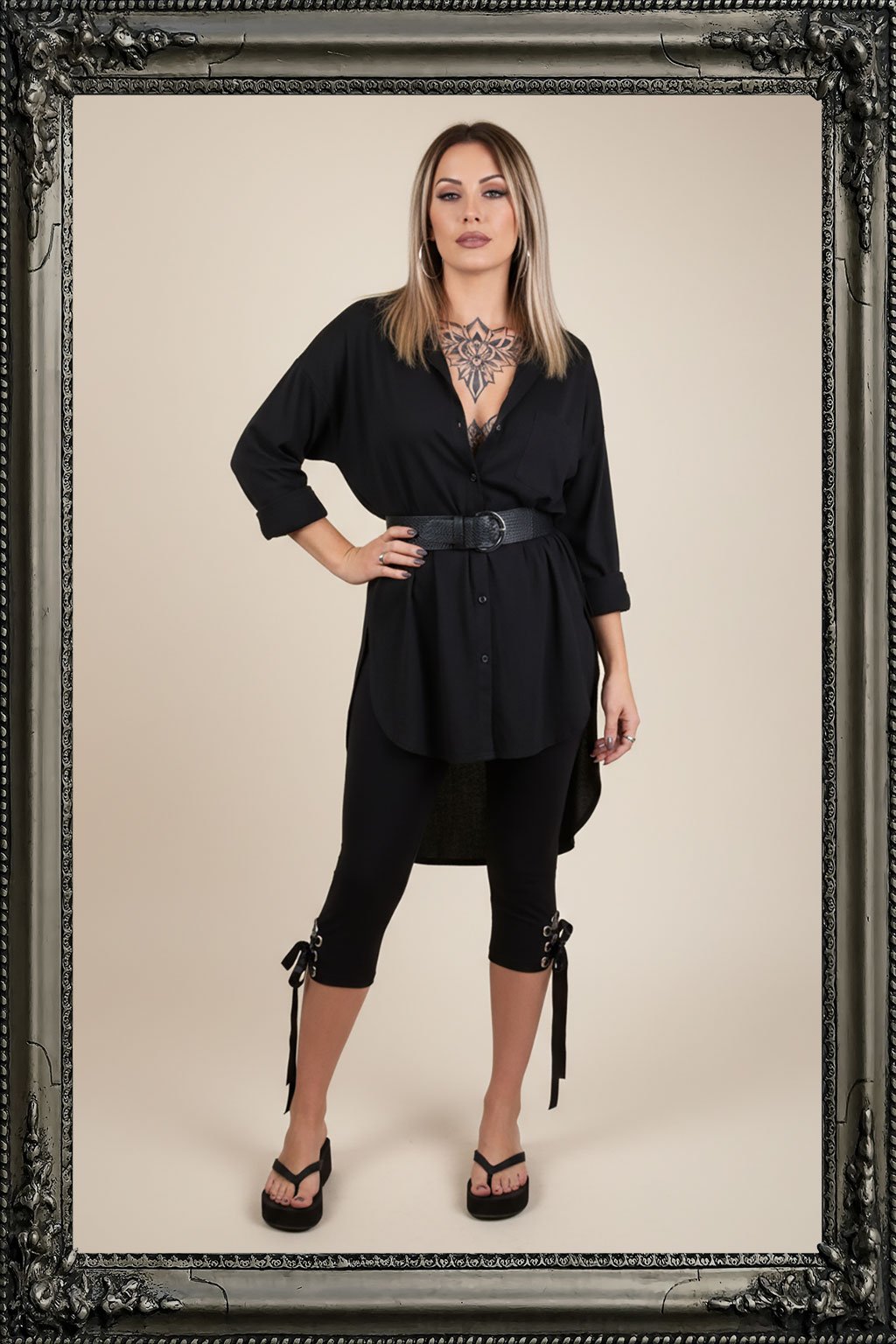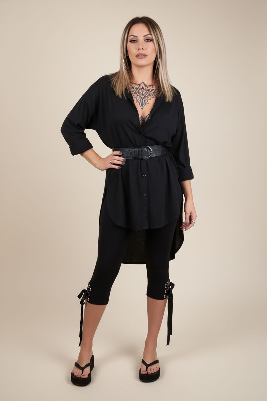 Stáhněte pozornost směrem k nohám. Šněrování je na levém lýtku černých tříčtvrtečních legín. Legíny jsou vyrobené z velmi kvalitního materiálu, jsou velmi pohodlné a přesto sexy.