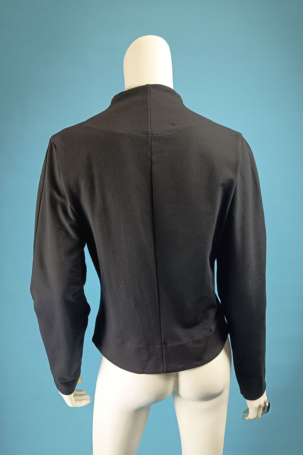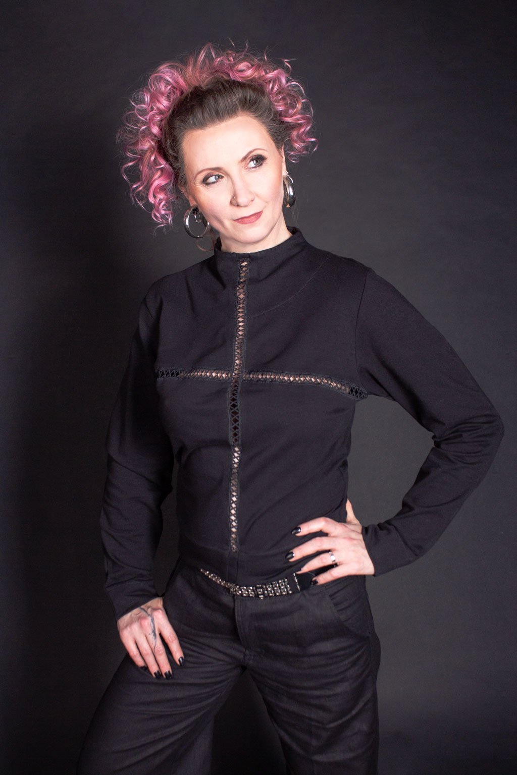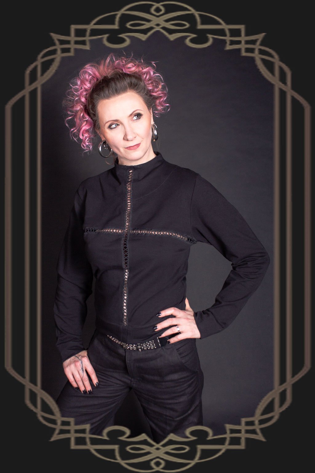 Černá lehká mikina, která má klidnou sílu a přesný detail. Na předním díle dominuje motiv kříže, zvýrazněný minimalistickou krajkou — žádná okázalost, jen rafinovaný kontrast mezi čistou linií a jemnou texturou, která přitáhne pohled až na druhý dojem. Nízký stojáček rámuje krk elegantně a nenuceně, volnější rukávy dodávají uvolněný, moderní vibe, zatímco projmutý, perfektně padnoucí střih drží siluetu ženskou a sebevědomou. Je to kousek, který funguje ve dne i v noci: s džínami a koženými doplňky působí lehce rebelsky, se sukní nebo úzkými kalhotami zase čistě a luxusně. Mikina, která nehraje na efekt — jen tiše říká, že víte, co děláte.