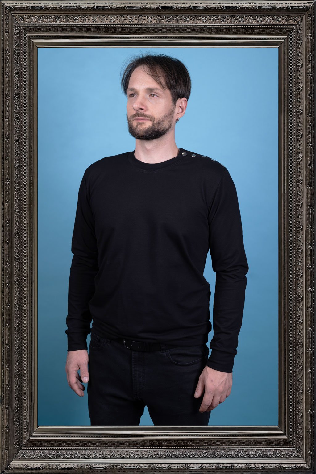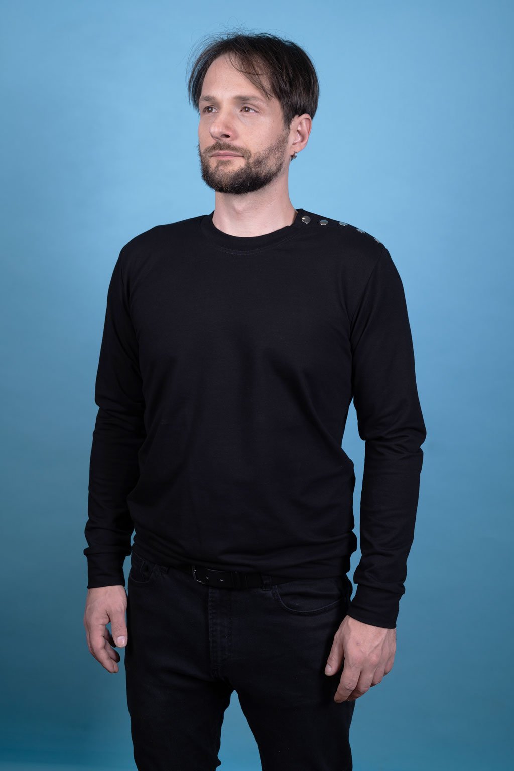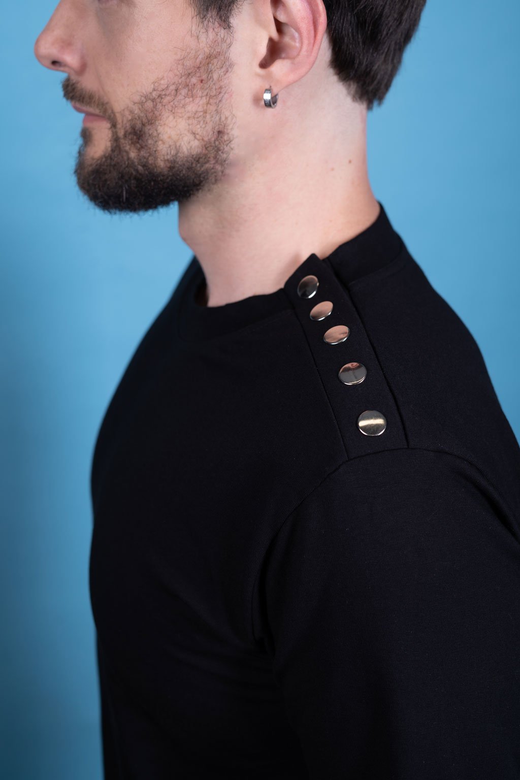 Pánská černá mikina Manon ze subtilní mikinoviny působí odlehčeně, ale nese v sobě výrazný charakter. Řada stříbrných patentů na levém rameni vytváří jedinečný prvek, který přitahuje pohledy a dodává mikině luxusní i gotický nádech.