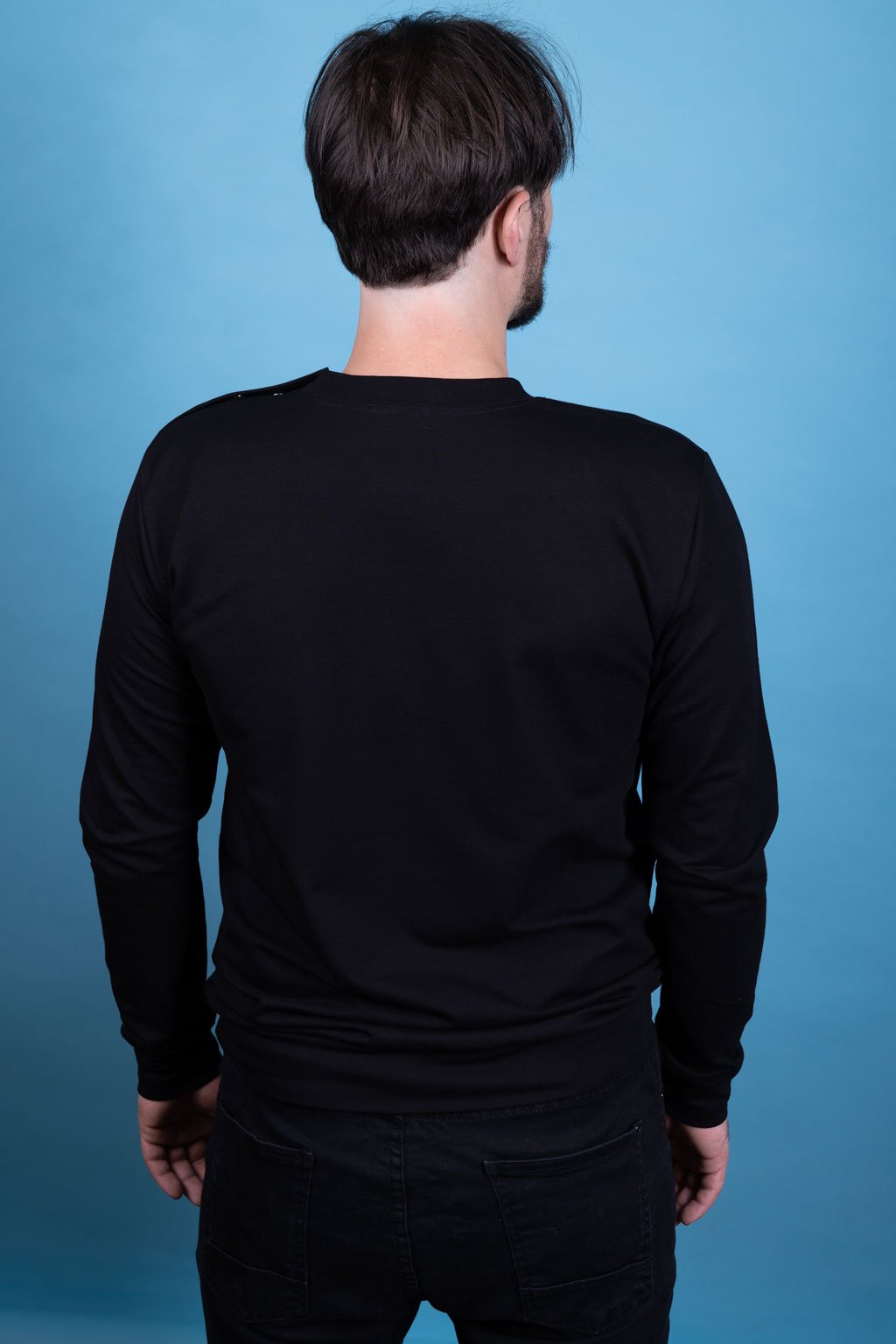 Lehká, elegantní a výrazná. Černá pánská mikina z jemnější mikinoviny je navržena s asymetrickým zapínáním na levém rameni, které tvoří řada stříbrných patentů. Tento detail posouvá minimalistický design do sféry originální luxusní módy s gotickým nádechem.