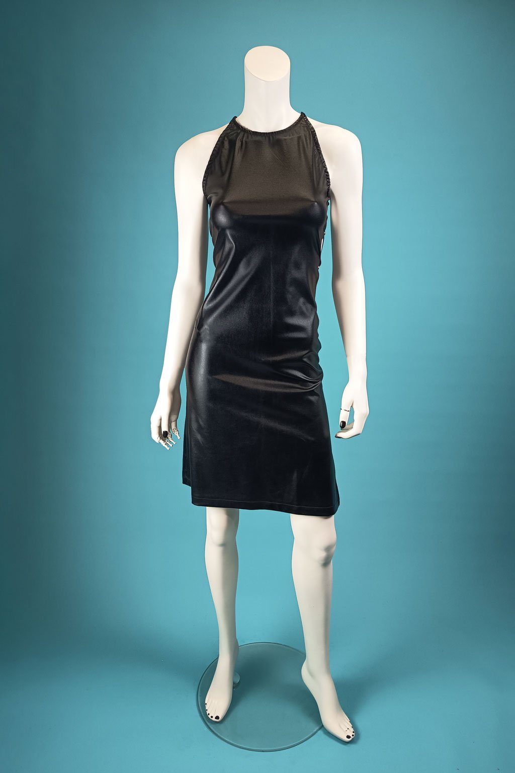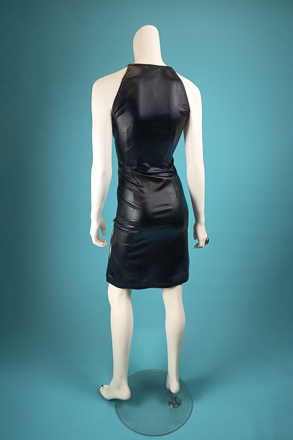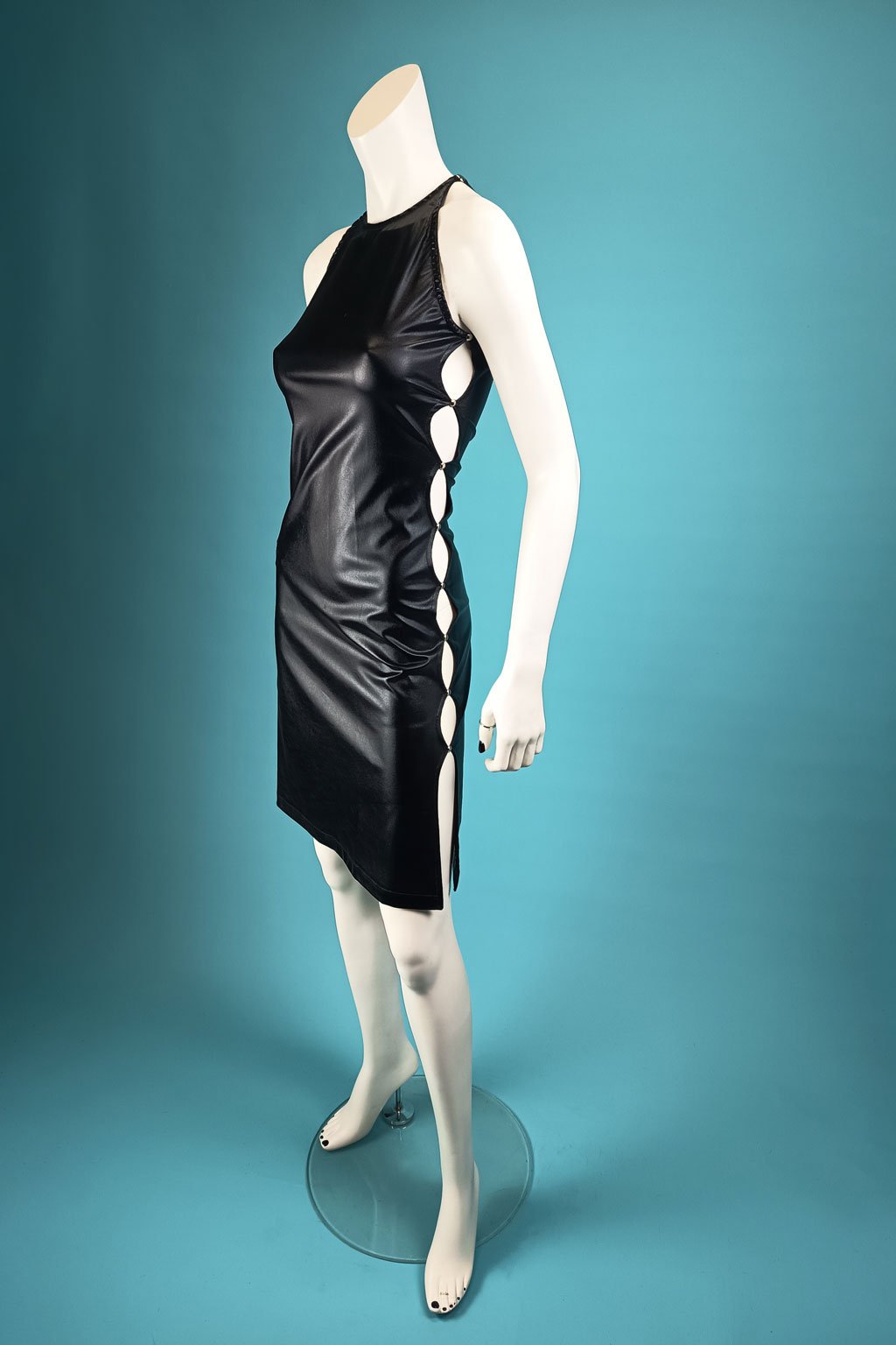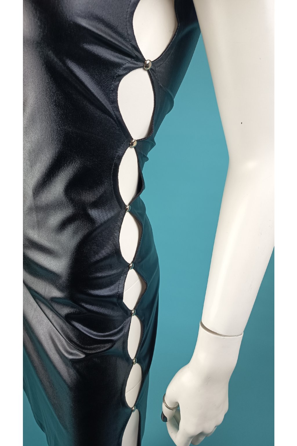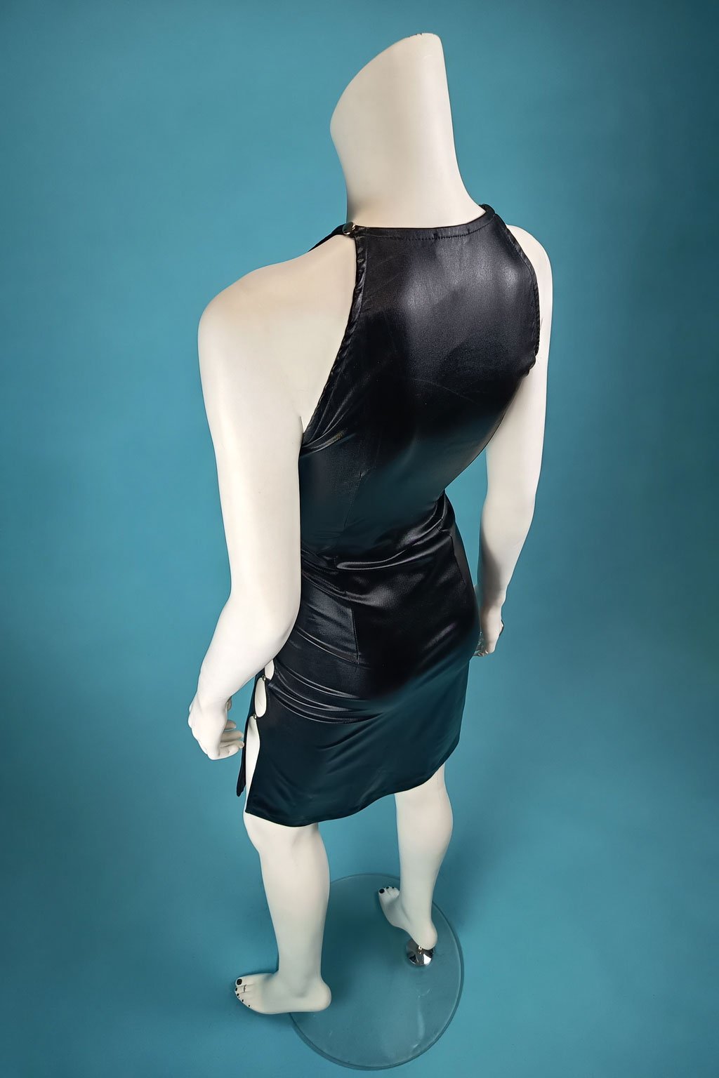 Minišaty s vysokým rozparkem na levém boku, zdobené kovovými peckami.