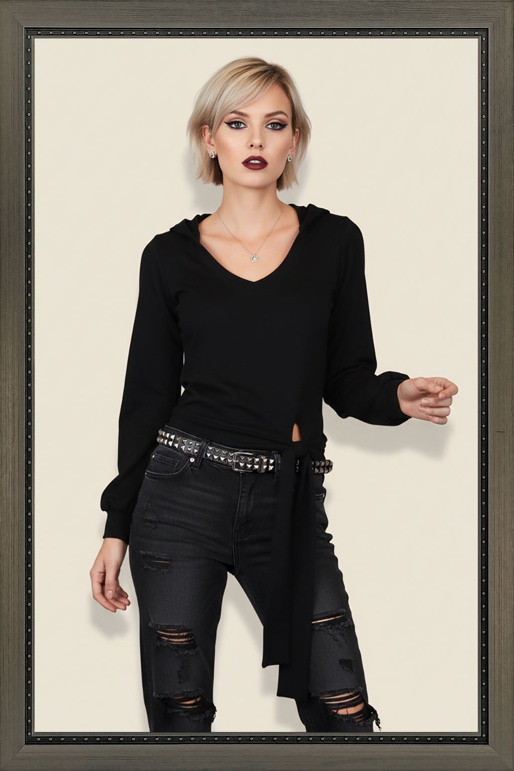 Lehká černá mikina s kapucí a hlubším výstřihem, zdobená dlouhou mašlí v dolním okraji. Sportovně elegantní a velmi ženský střih. Mikina je vyrobena z lehkého a pohodlného materiálu, který je ideální pro každodenní nošení. Má kapuci, která přidává sportovní prvek a zároveň chrání před nepříznivým počasím. Hlubší výstřih mikiny vytváří ženský a svůdný dojem, zvýrazňuje krásu dekoltu a dodává mikině šarm.