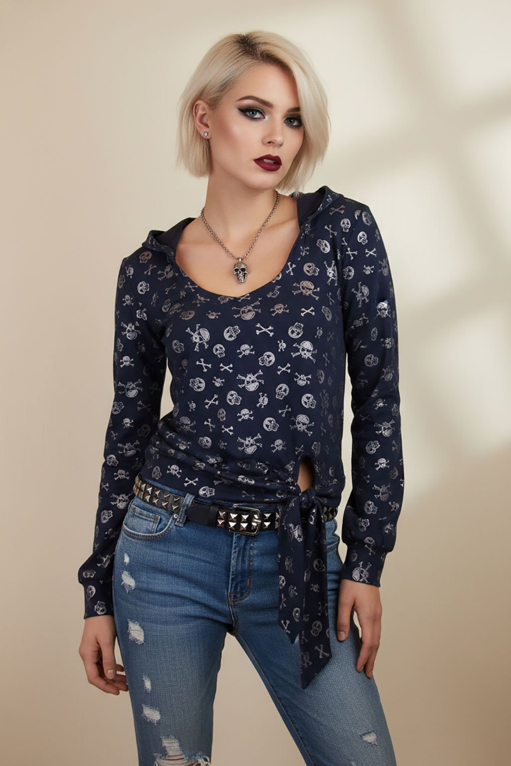 Lehká mikina s kapucí a hlubším výstřihem, zdobená dlouhou mašlí v dolním okraji. Sportovně elegantní a velmi ženský střih. Lehká černá mikina s kapucí a hlubším výstřihem, zdobená dlouhou mašlí v dolním okraji. Sportovně elegantní a velmi ženský střih. Mikina je vyrobena z lehkého a pohodlného materiálu, který je ideální pro každodenní nošení. Má kapuci, která přidává sportovní prvek a zároveň chrání před nepříznivým počasím. Hlubší výstřih mikiny vytváří ženský a svůdný dojem, zvýrazňuje krásu dekoltu a dodává mikině šarm.