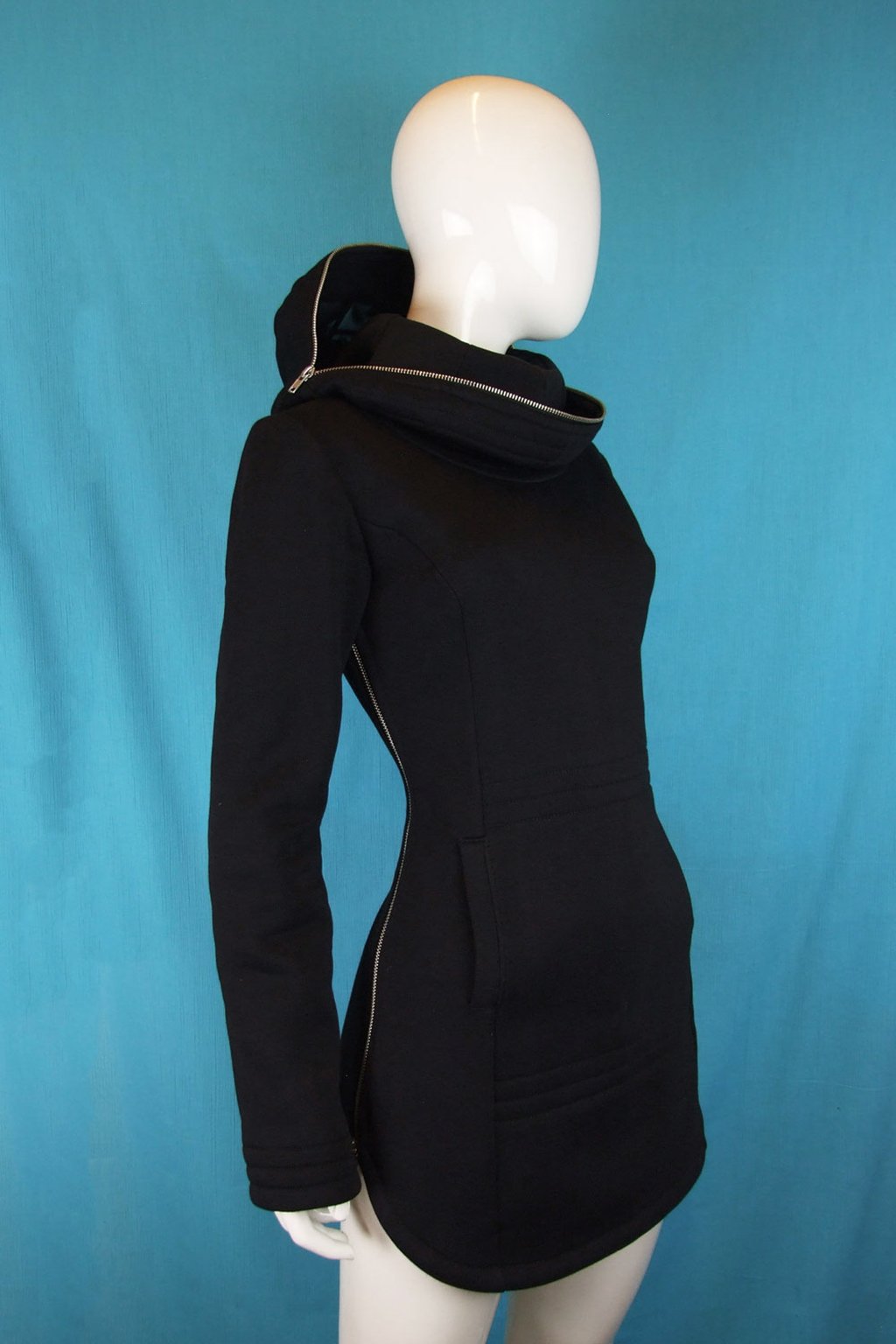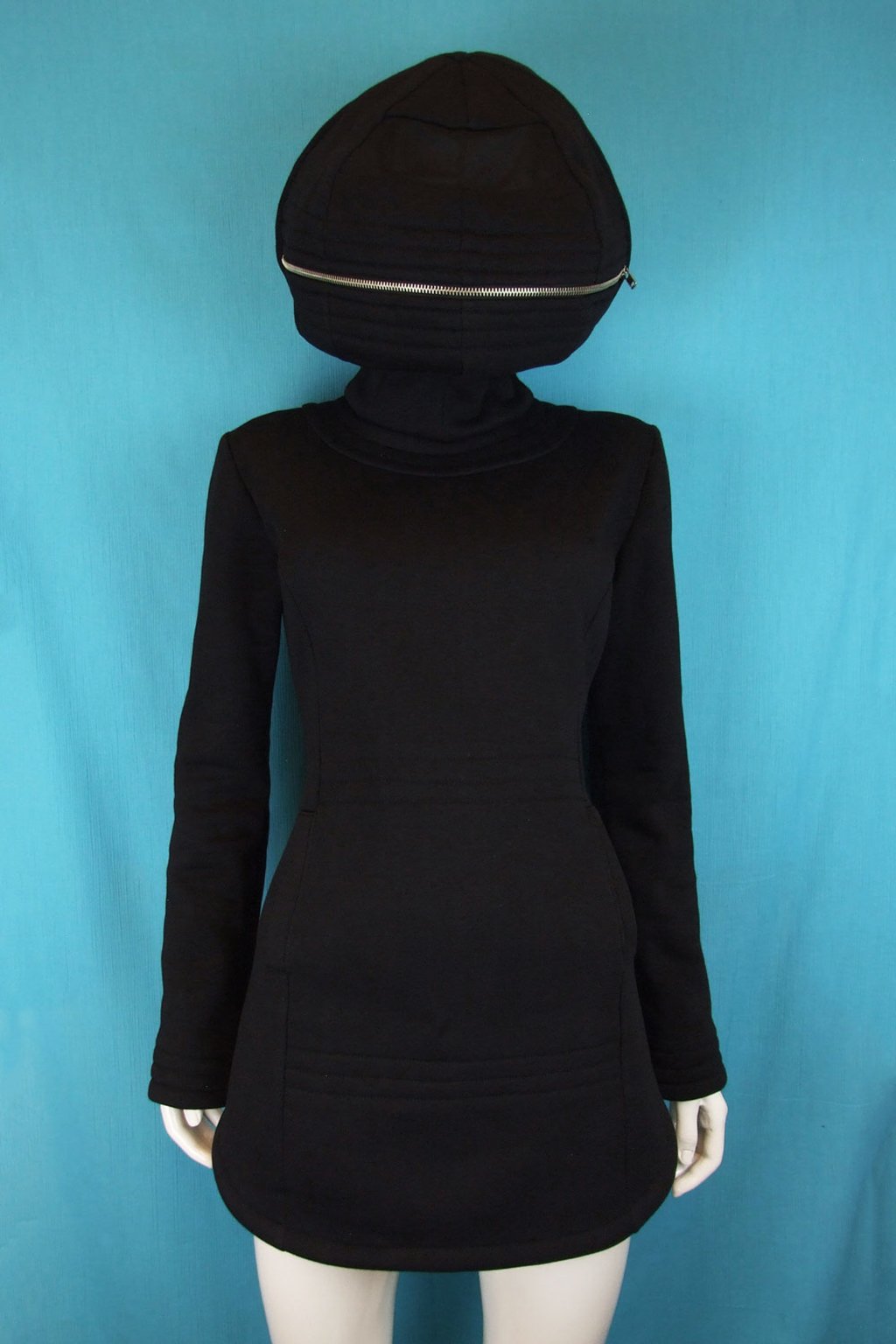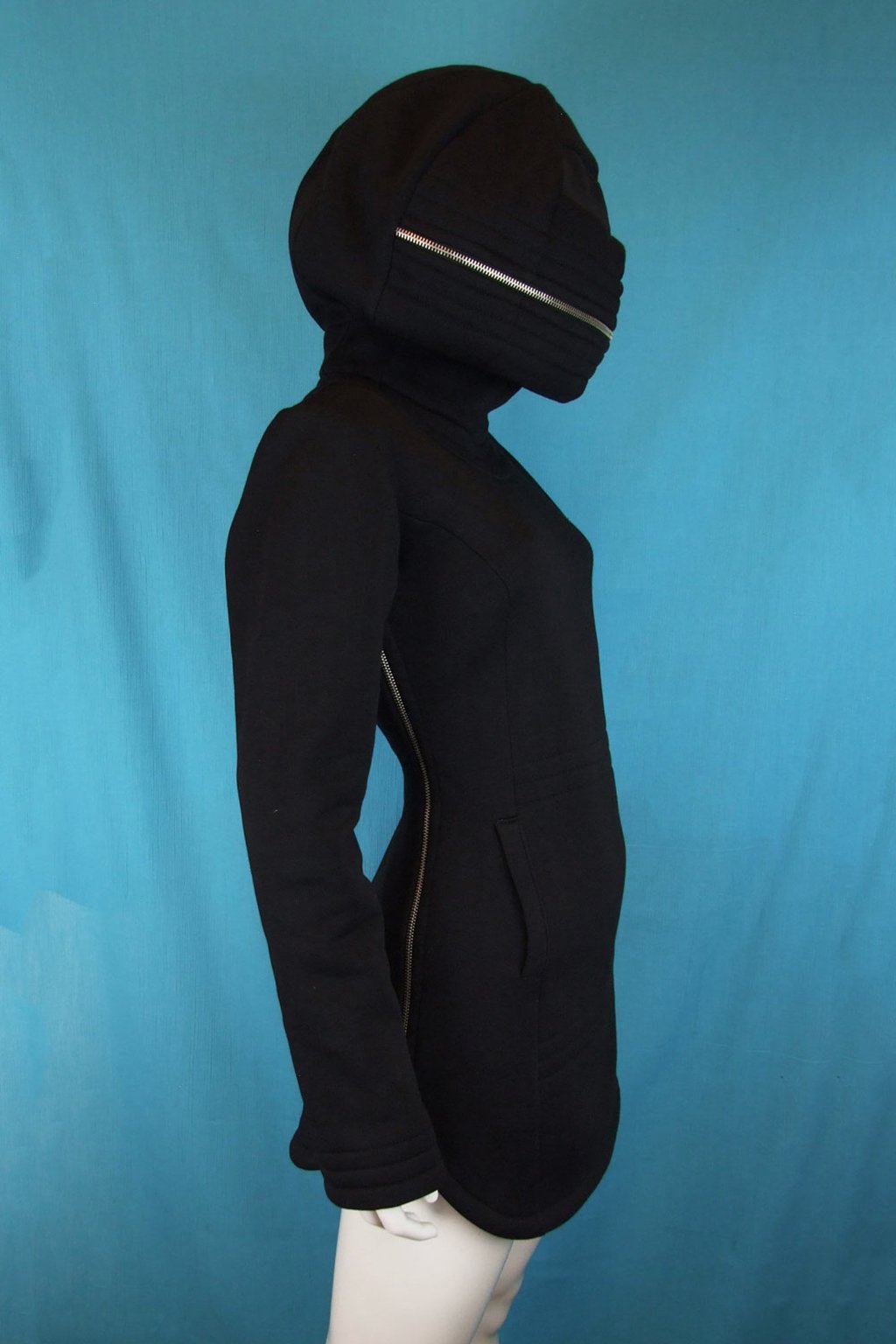 Tato delší černá mikina s unikátní zakuklenou kapucí Alien je ideální volbou pro ty, kteří hledají něco neobvyklého. Mikina má projmutý střih, který perfektně sedí na postavě, a je navržena tak, aby se snadno přetahovala přes hlavu díky zipům umístěným na bocích. Kapuce Alien je navíc vybavena transparentní vsadkou v místě očí, což umožňuje její kompletní zapnutí, aniž byste ztratili přehled o okolí. Vyrobená z velmi kvalitní hřejivé silnější mikinoviny, poskytuje teplo a komfort i v chladnějších dnech.