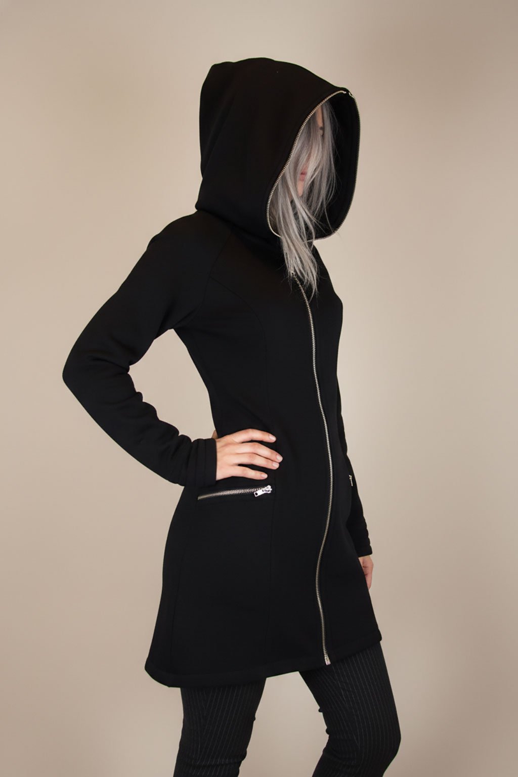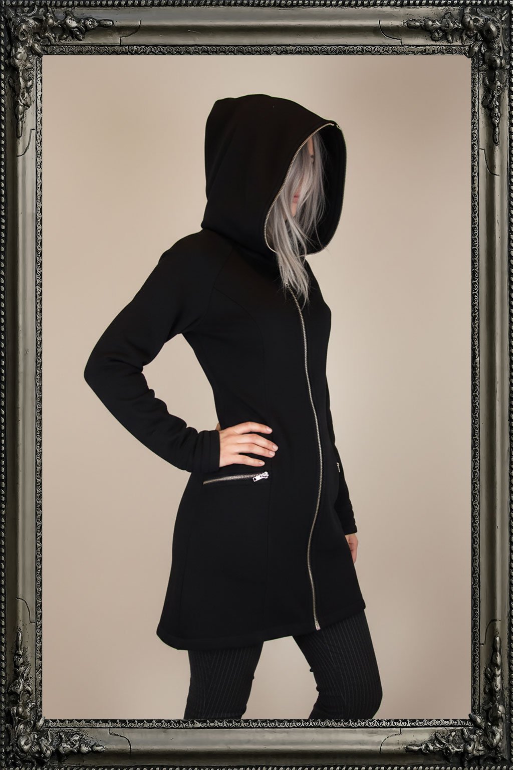 Delší černá rozepínací mikina se zakuklenou kapucí, do které se můžete úplně zapnout nebo si nastavit jak jí budete nosit. Variabilní nastavení kapuce / límec / chomout, podle toho, který se zipů zapnete nebo ne. Vyrábíme jí z velmi kvalitní hřejivé silnější mikinoviny.