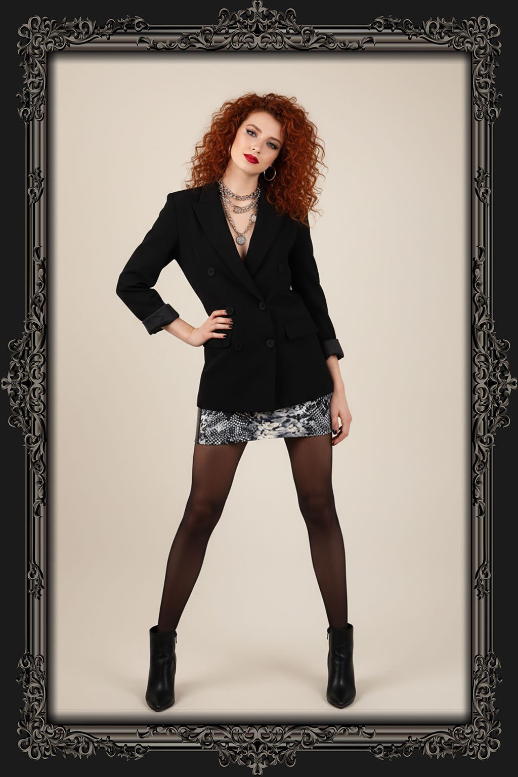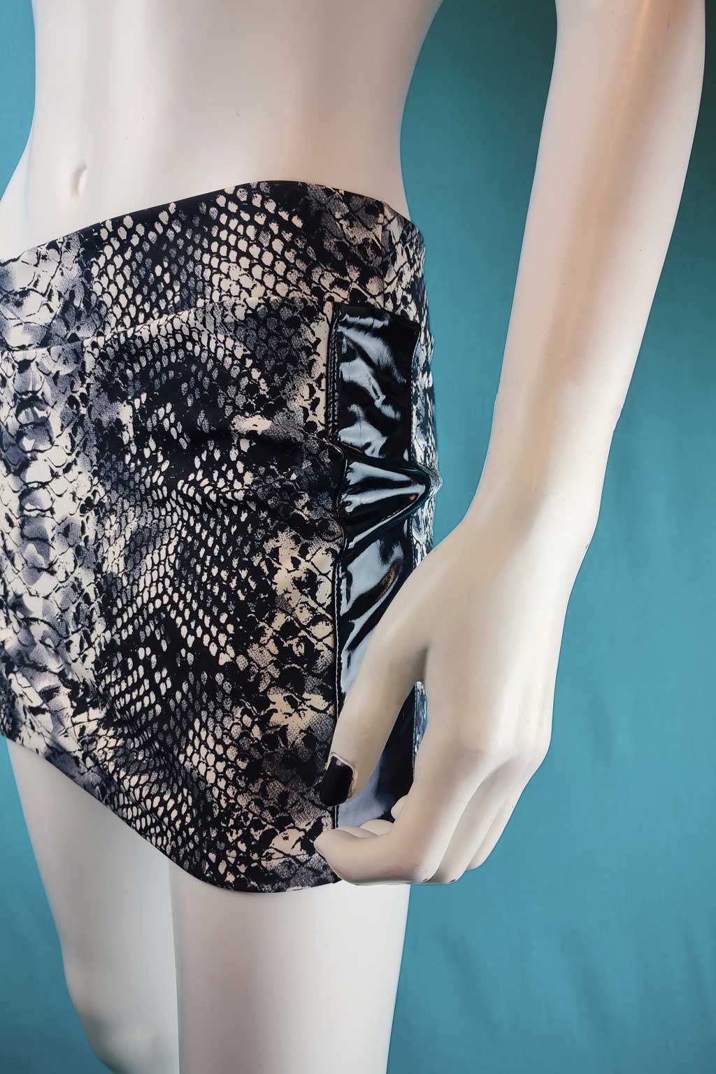 Originální minisukně z pevného elastického materiálu s potiskem hadí kůže. Na boku je vsadka z lakované elastické koženky. Pouze jeden kus ve velikosti S