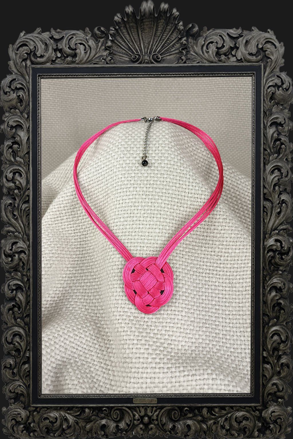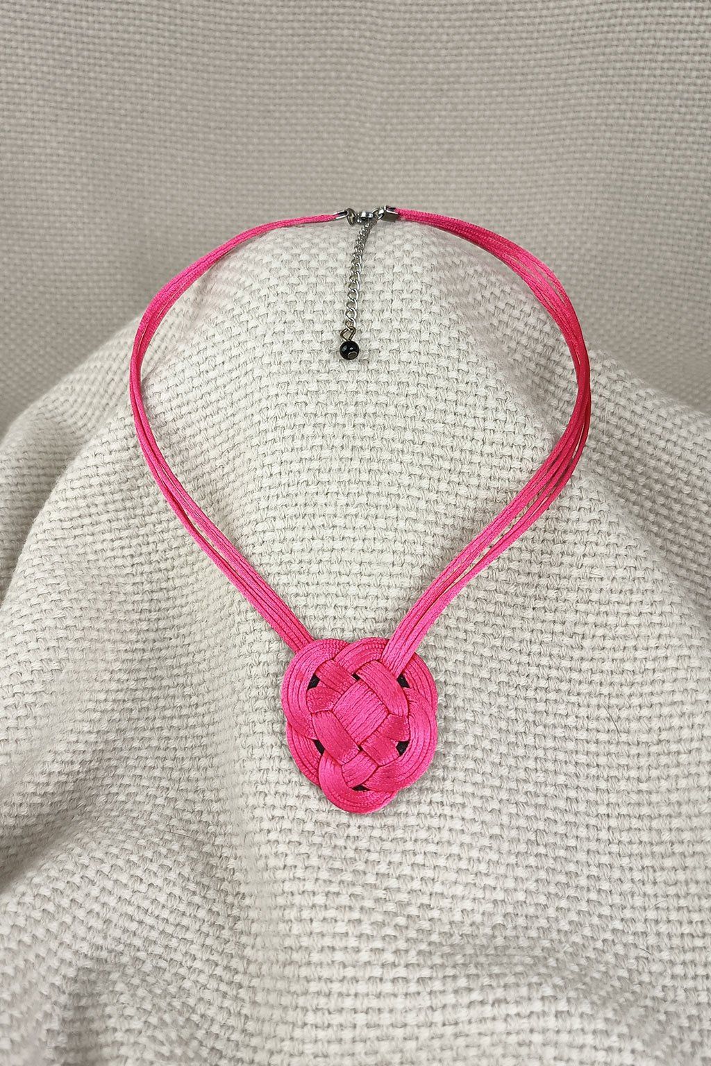 Ozdobte svůj krk originálním náhrdelníkem s velkým ručně vázaným uzlem, který se stává výrazným dominantním prvkem celého šperku. Náhrdelník je vytvořený z různobarevných lesklých provázků, které mu dodávají jedinečný vzhled, jemný lesk a hravý charakter.
