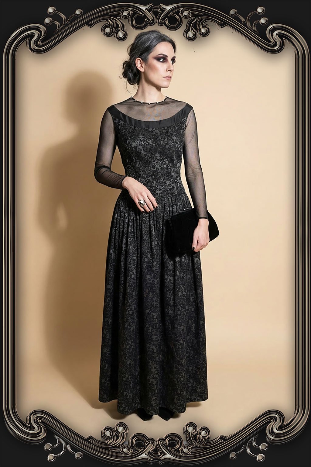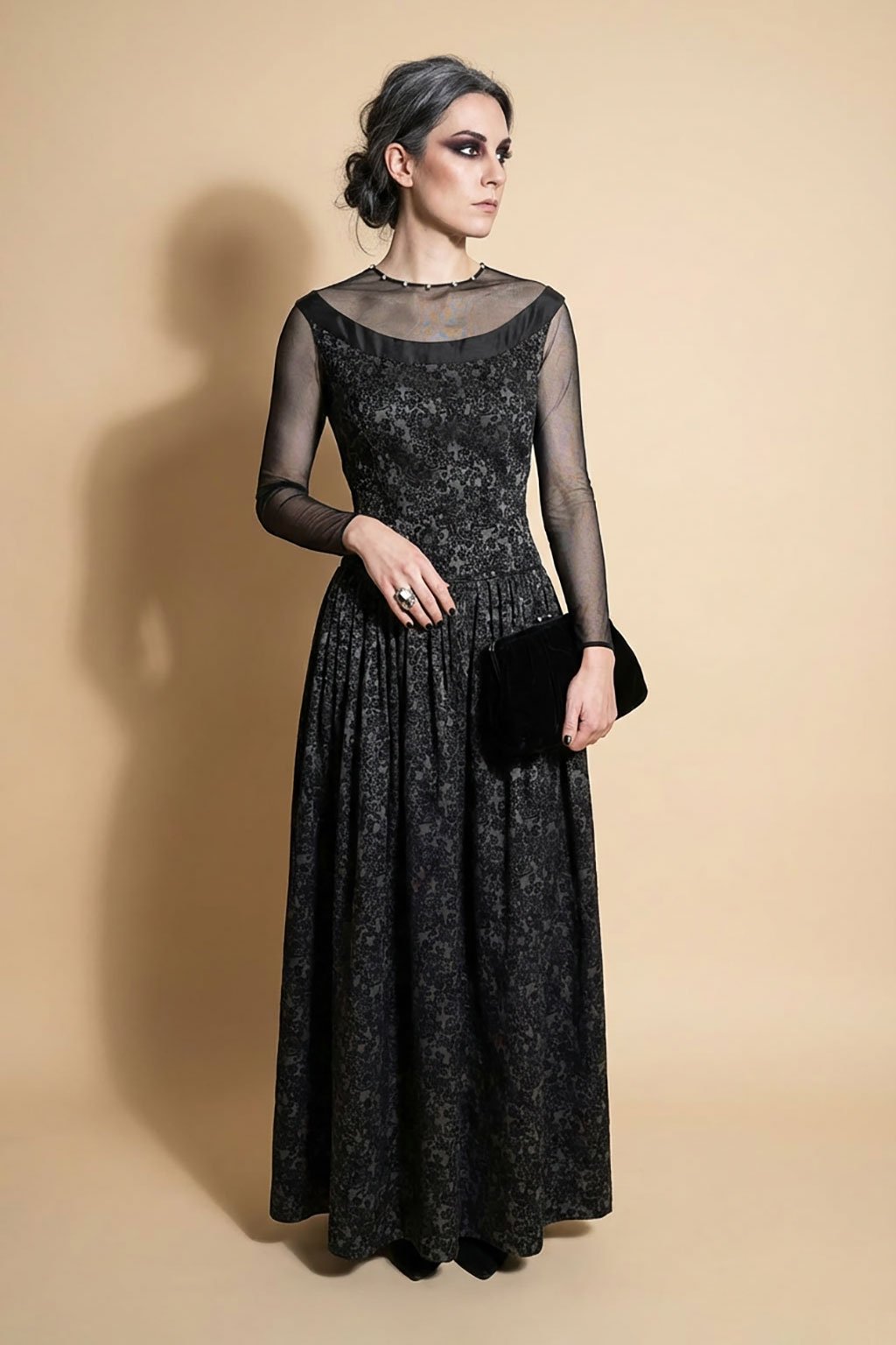 Nocturne Velvet jsou dlouhé společenské šaty pro dámy s bohatě řasenou sukní a živůtkem se šněrovačkou na zádech, vyrobené pouze v jednom jediném kuse. Pevný tmavě šedý taft se sametovým potiskem doplňují dlouhé rukávy a vsadka v dekoltu z jemného elastického tylu.