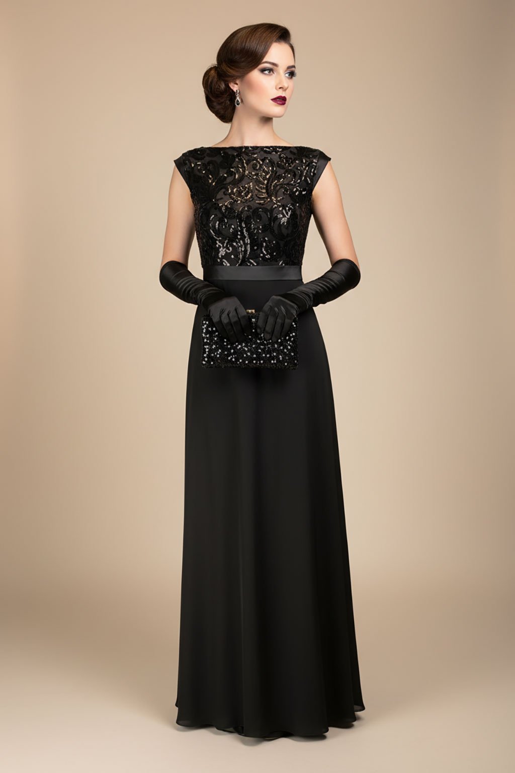 Dominantou je živůtek s lodičkovým výstřihem: čistý, velmi společenský tvar, který zvýrazní klíční kosti a působí sofistikovaně. Elastický materiál se pohodlně přizpůsobí postavě a ornamentální flitrová výšivka přidá jemný třpyt a strukturu — ne jako plošný lesk, ale jako promyšlený dekor, který se ve světle krásně rozezní.