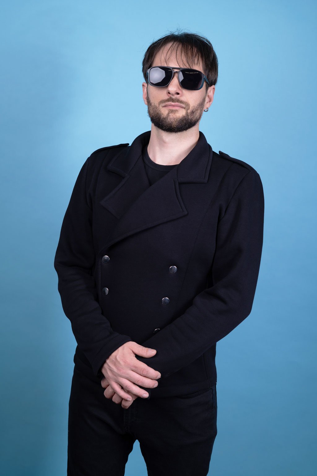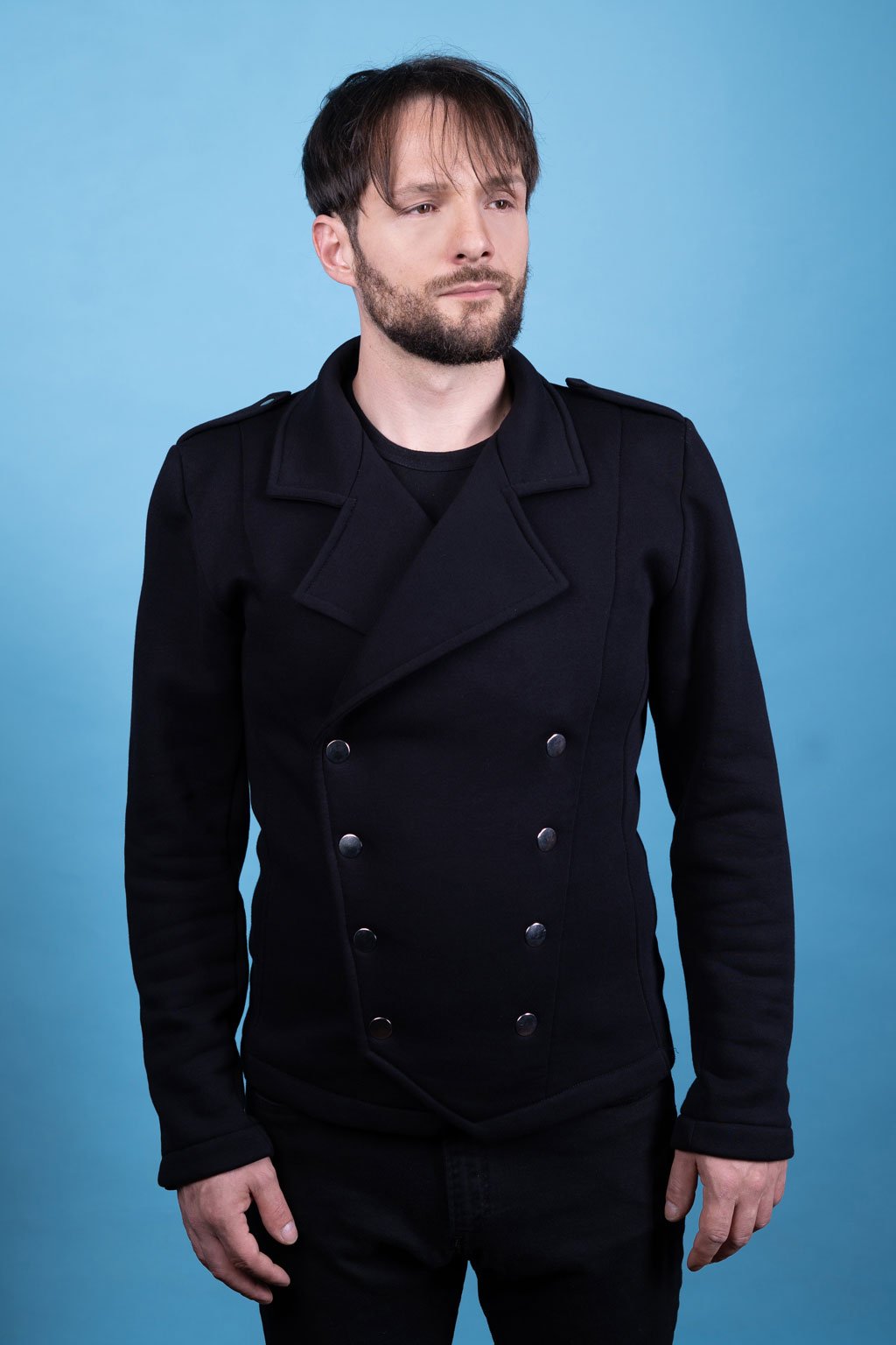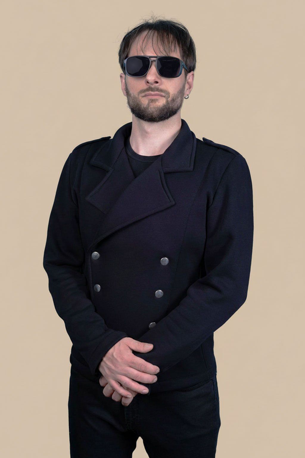 Pánská černá mikina Manon s fazonou a dvouřadovým zapínáním na stříbrné patenty představuje unikátní spojení saka a mikiny. Rukávy s vysokými rozparky a řadou menších patentů podtrhují odvážný design, který fascinuje svou precizností i dramatickým nádechem.