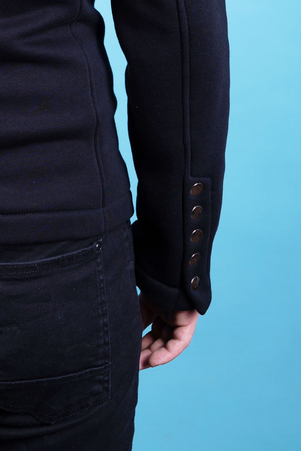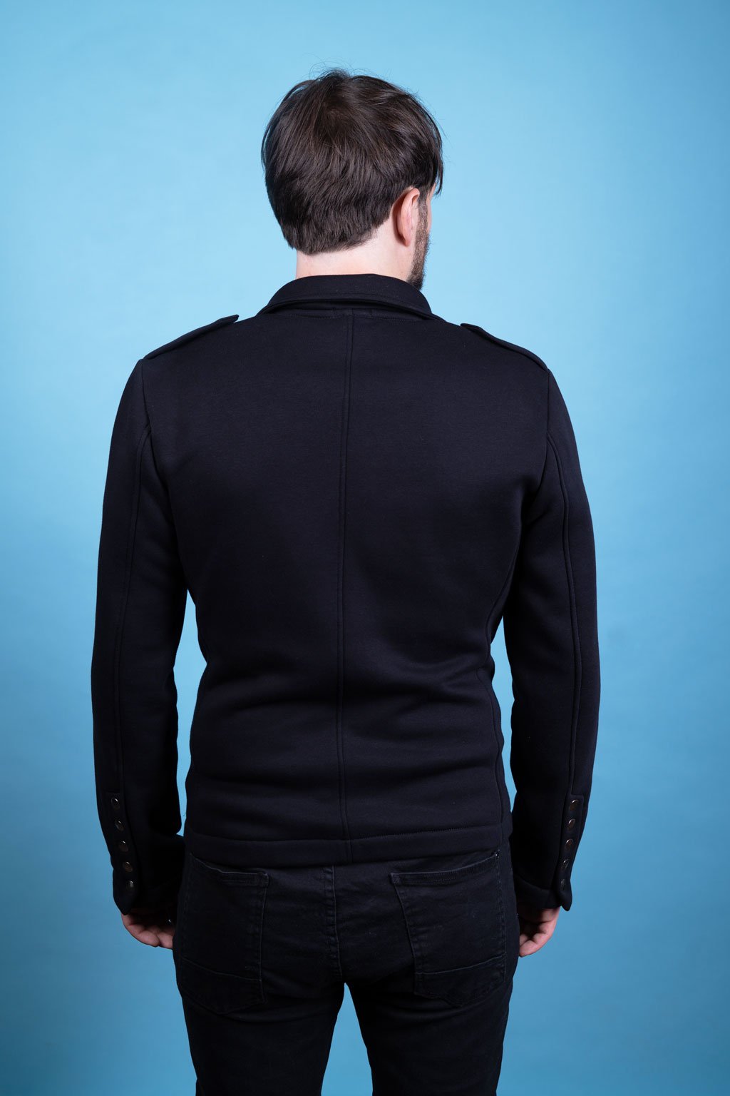 Mikina je ušita z pevnějšího materiálu, díky čemuž drží tvar, ale zároveň poskytuje komfort a pohodlí. Propracovaný střih kombinuje eleganci saka s neformální ležérností mikiny.