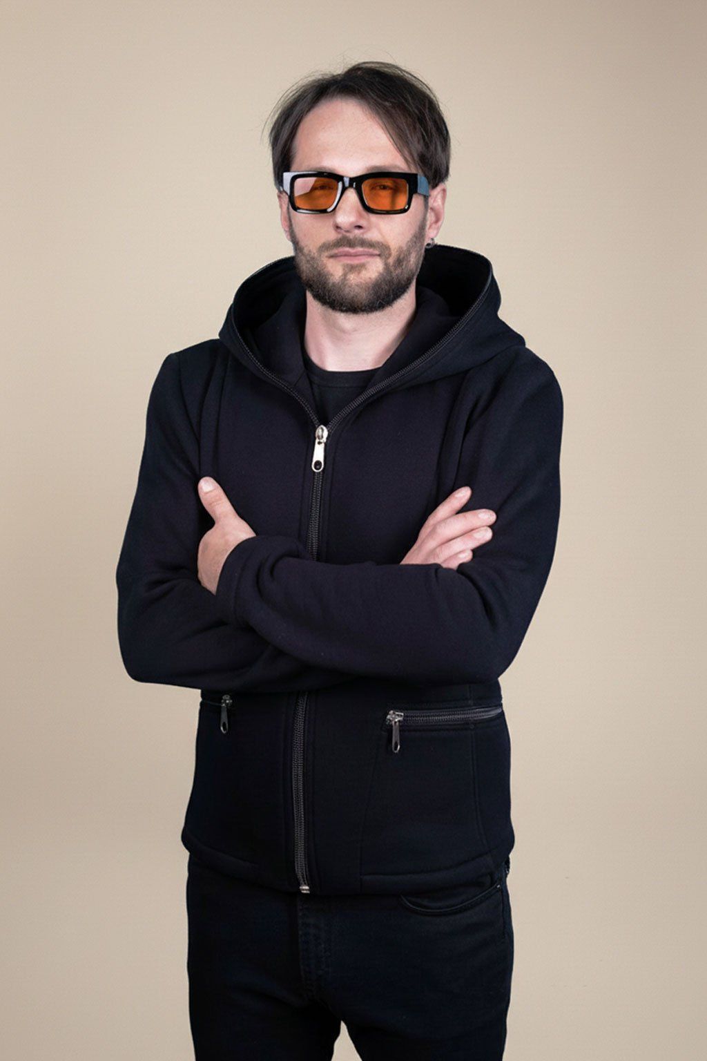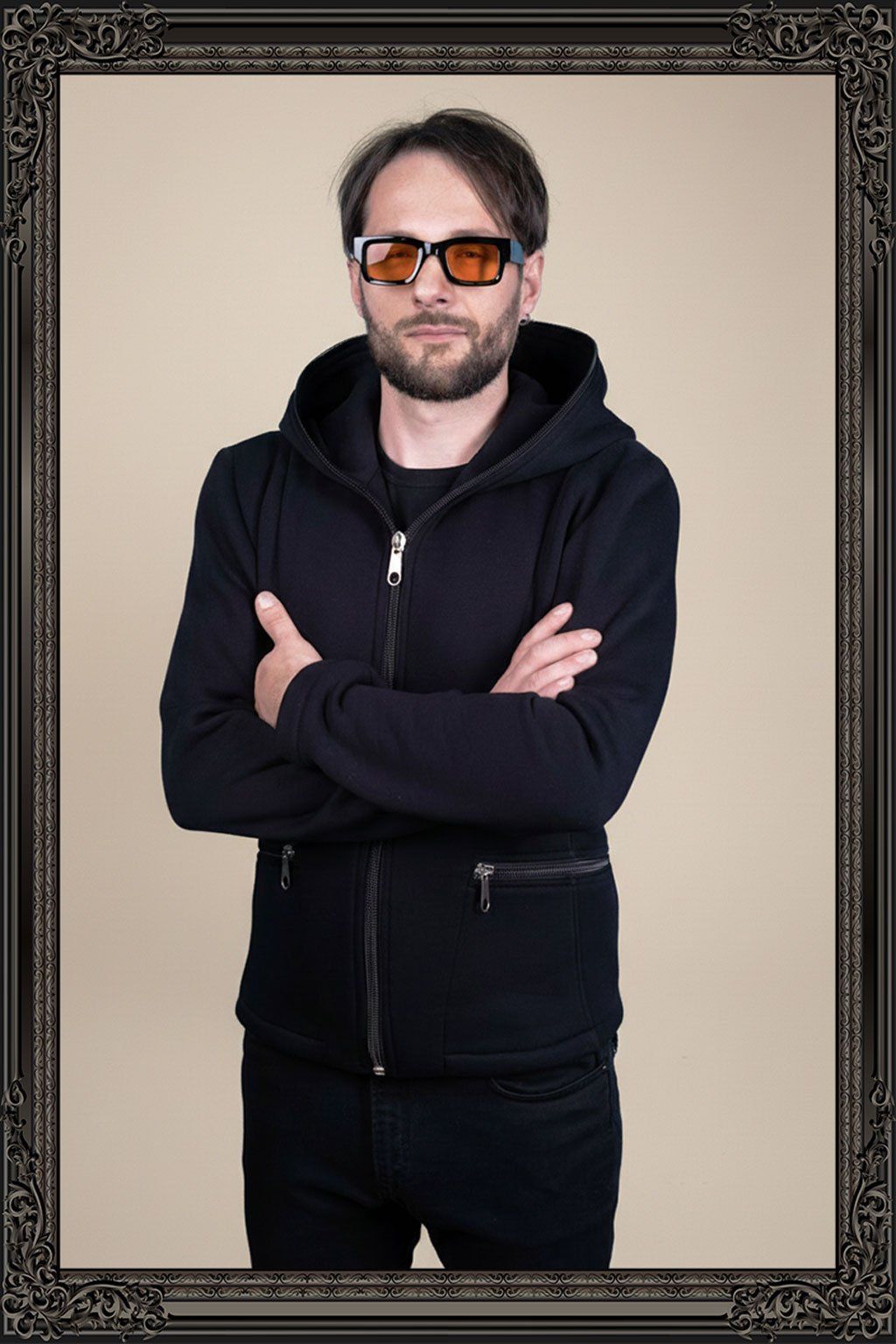 Pánská mikina s kapucí Manon kombinuje luxusní střih a gotickou symboliku kovových detailů. Masivní zip se stříbrným jezdcem, doplněný o kapsy ve stejném stylu, vytváří výrazný kontrast proti hluboké černi.
