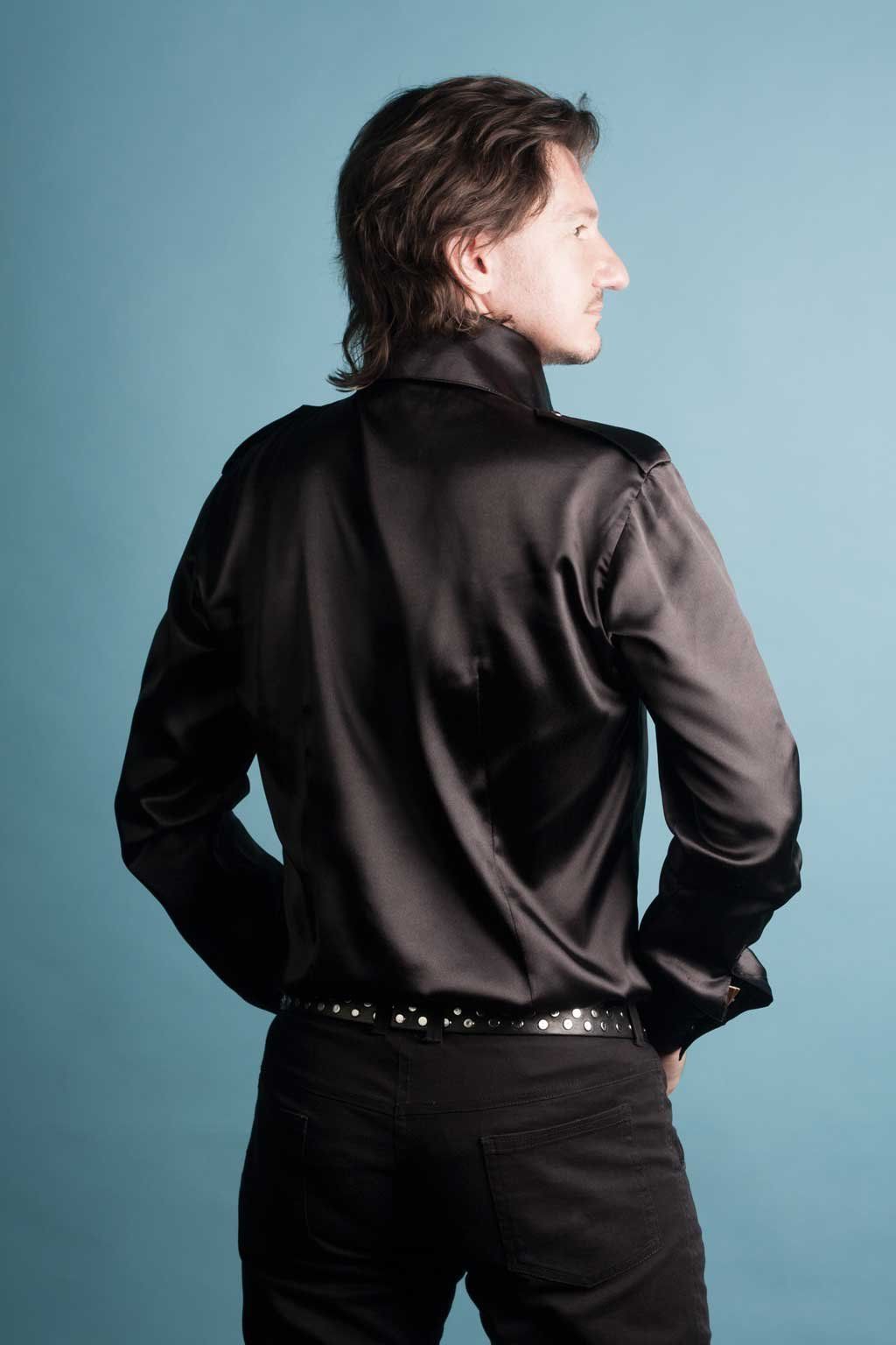 Pánská černá saténová košile s vysokým límcem a nárameníky. Zapíná se na malé patentky. Saténová košile je stylovou volbou pro muže, který chce vypadat elegantně a sofistikovaně při speciálních událostech.