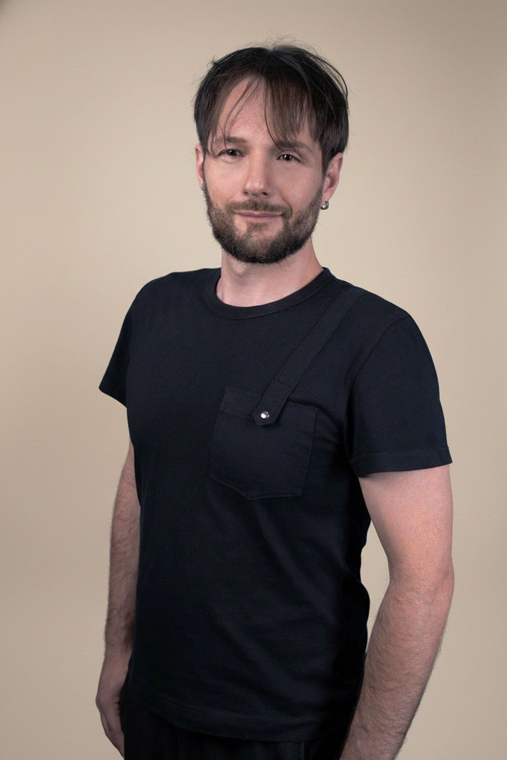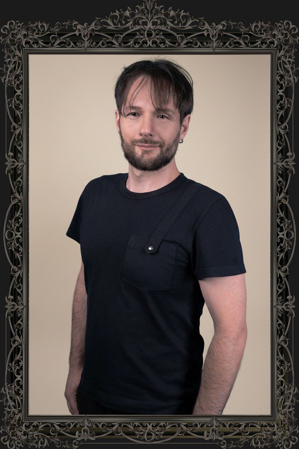 Elegantní, ale s temným podtónem. Černé pánské triko z vysoce kvalitní bavlny kombinuje čistý střih s originálním detailem – malou náprsní kapsičkou zapínanou na stříbrný patent. Tento prvek dodává tričku nejen funkčnost, ale i jemný nádech luxusu s gotickým akcentem.