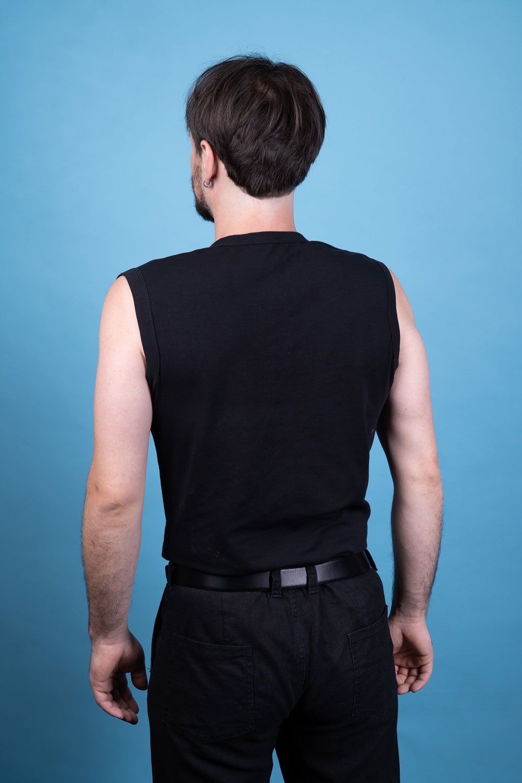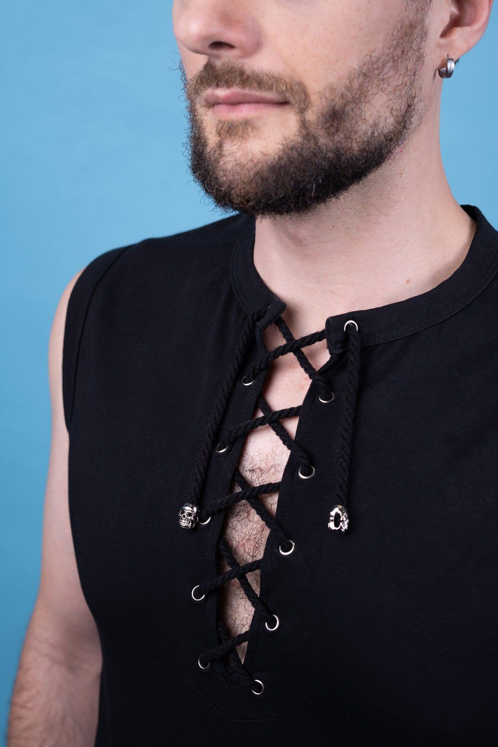 Originální pánské triko bez rukávů v černé barvě zaujme detailním šněrováním ve výstřihu, které dodává celku osobitý charakter. Šňůrka je zakončena malou stříbrnou lebkou – decentním, ale výrazným prvkem, jenž podtrhuje unikátnost designu.