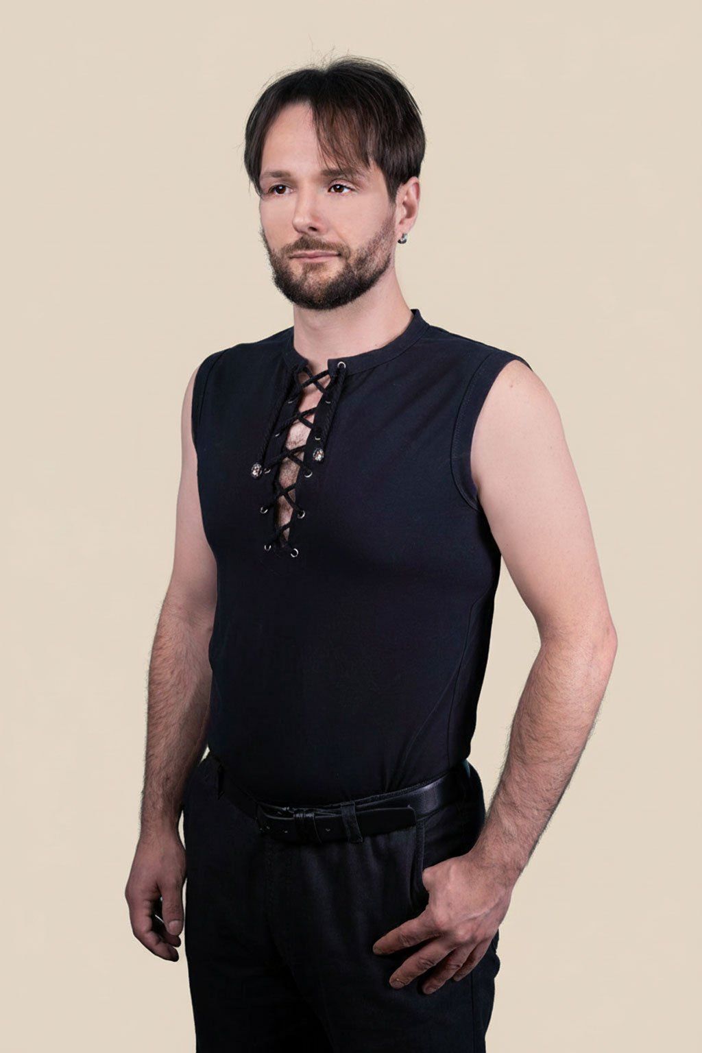 Pánské černé triko bez rukávů Manon se šněrováním ve výstřihu a stříbrnou lebkou na šňůrce přináší dokonalou rovnováhu mezi minimalismem a gotickou estetikou. Každý detail je symbolem síly, individuality a tajemství, které se skrývá pod povrchem.