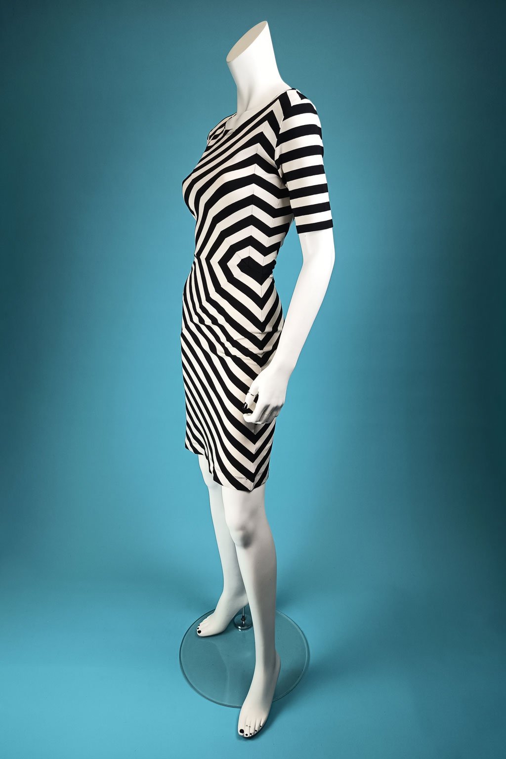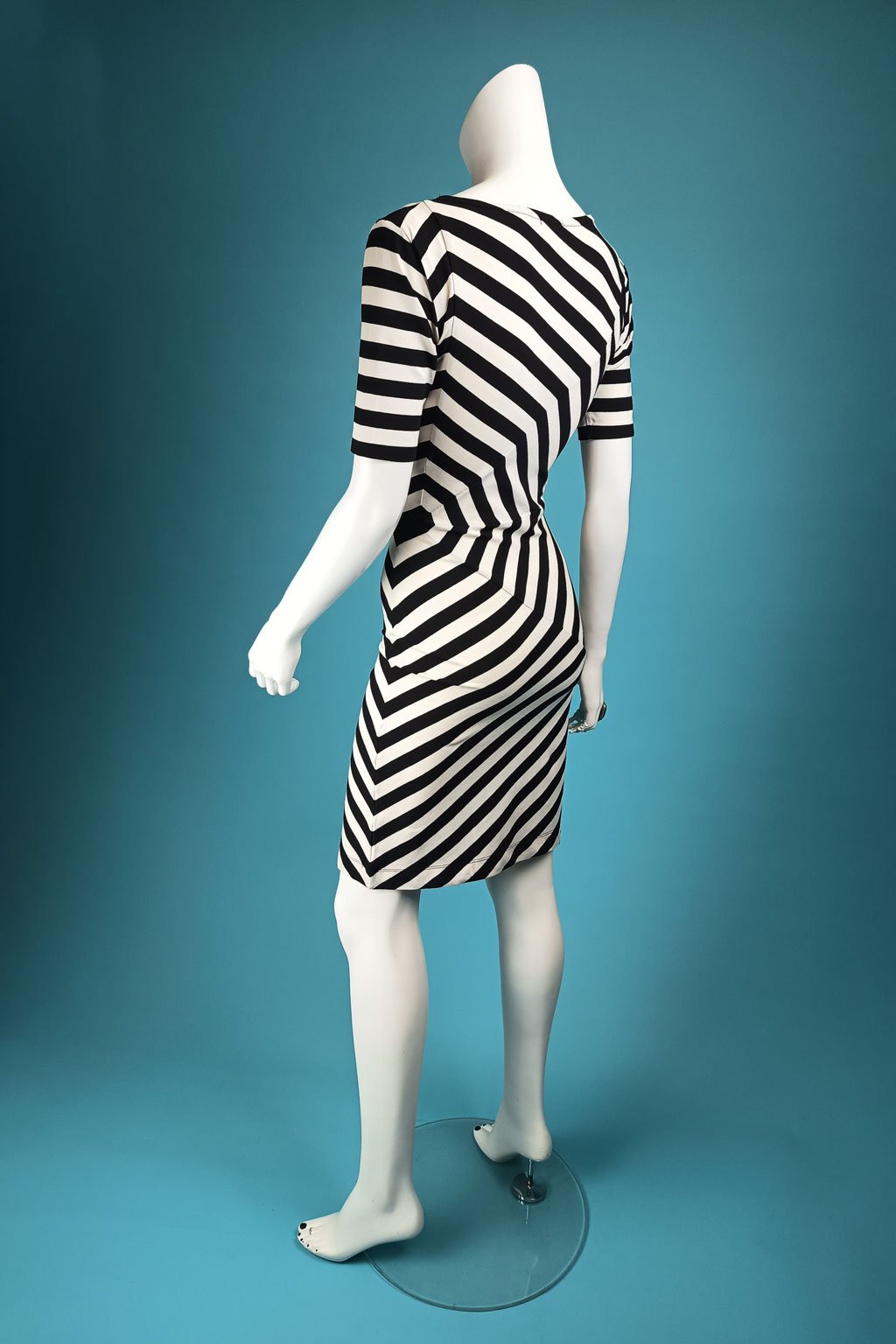 Délka a střih šatů jsou navrženy tak, aby podtrhovaly ženskou siluetu a zajišťovaly elegantní vzhled. Pruhovaný vzor opticky tvaruje postavu a dodává ženskost každému pohybu.