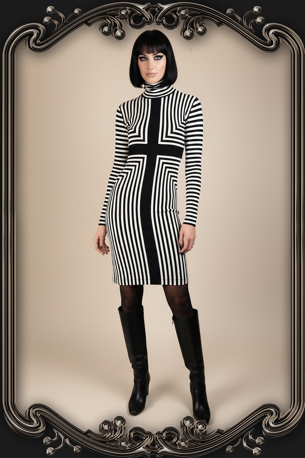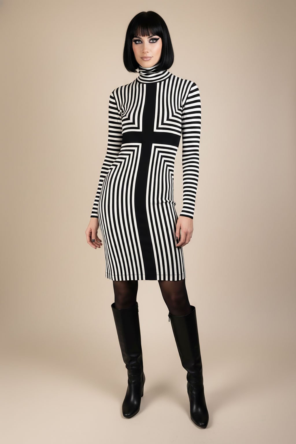 Pruhované černobílé šaty s křížem a rolákem vel. S