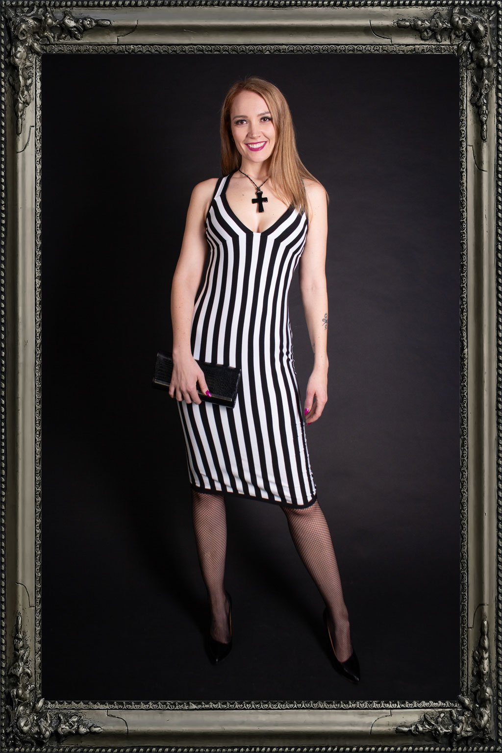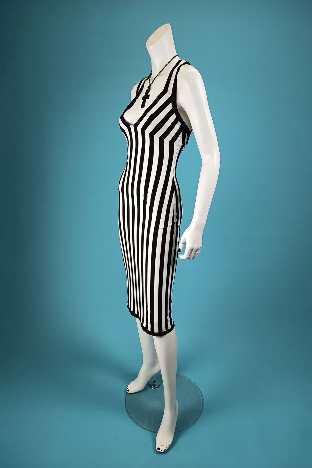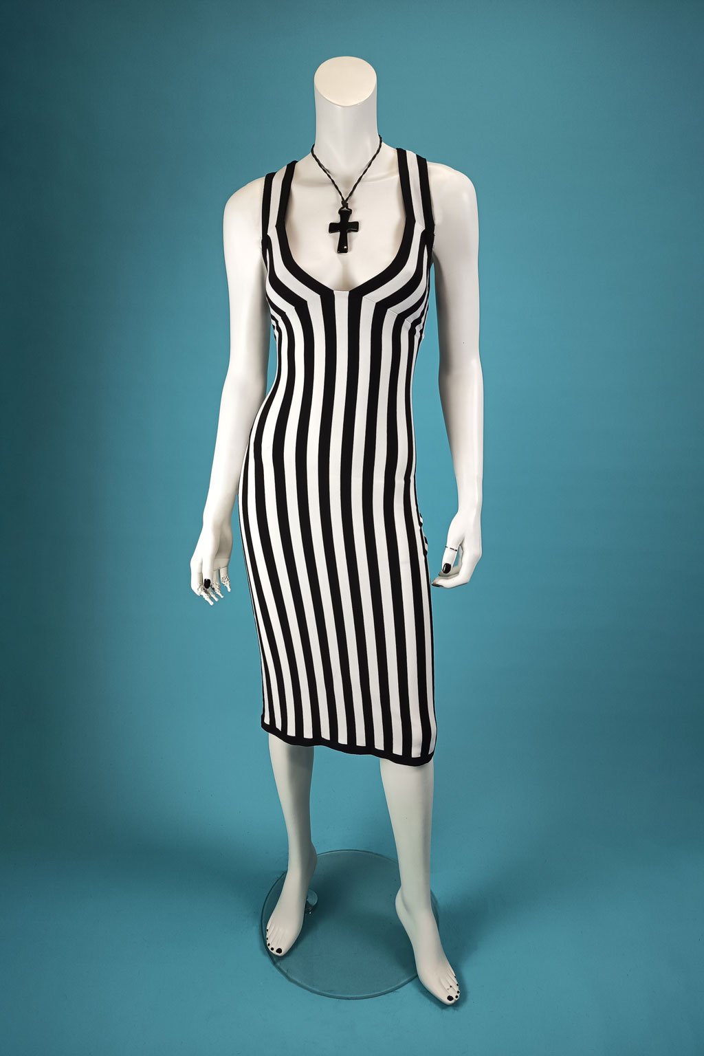 Představujeme elegantní pouzdrové šaty v délce pod kolena, které jsou ideální volbou pro každou příležitost, kdy chcete vypadat stylově a sofistikovaně. Tyto šaty jsou vyrobené z elastického materiálu, který dokonale obepne vaši postavu a zvýrazní její křivky. Výrazné černobílé pruhy dodávají šatům moderní a dynamický vzhled. Šaty mají hlubší výstřih na zádech a široká překřížená ramínka, což přidává na eleganci a originalitě. Precizní ruční zpracování zajišťuje vysokou kvalitu a jedinečnost.