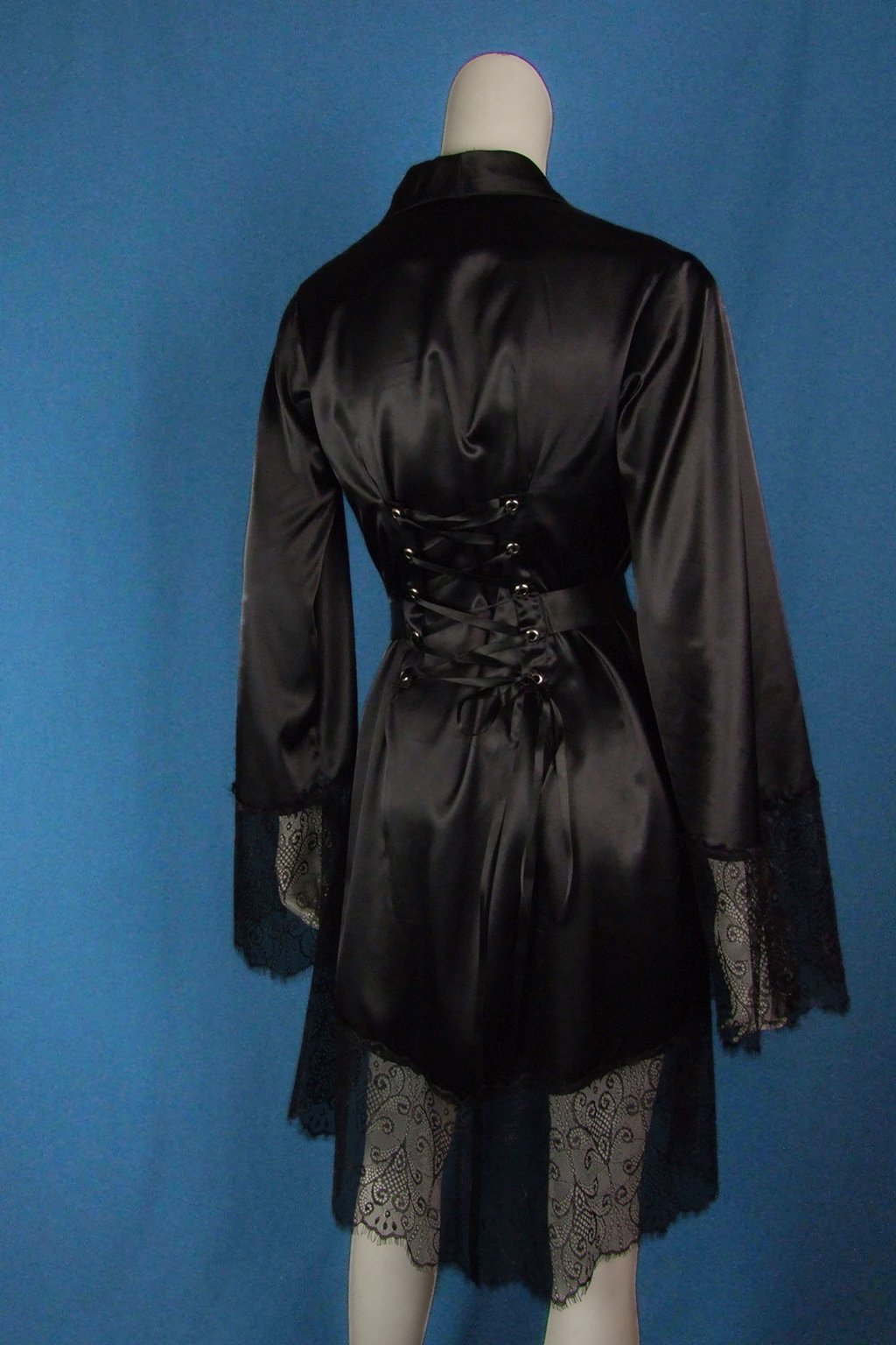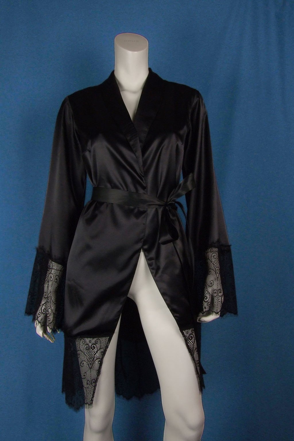 Jemně lesklý satén splývá po těle a působí elegantně, zatímco francouzská krajka podtrhuje luxusní charakter pláště. Šněrování na zádech umožní decentně upravit obvod a vytvarovat siluetu. Zavazovací pásek v pase zvýrazní křivky a poskytne bezpečné, přitom pohodlné zapnutí. Široké rukávy nabídnou volnost pohybu, šálový límec rámuje dekolt a dodává nadčasovou noblesu. Délka nad kolena je praktická pro domácí pohyb a zároveň velmi ženská.