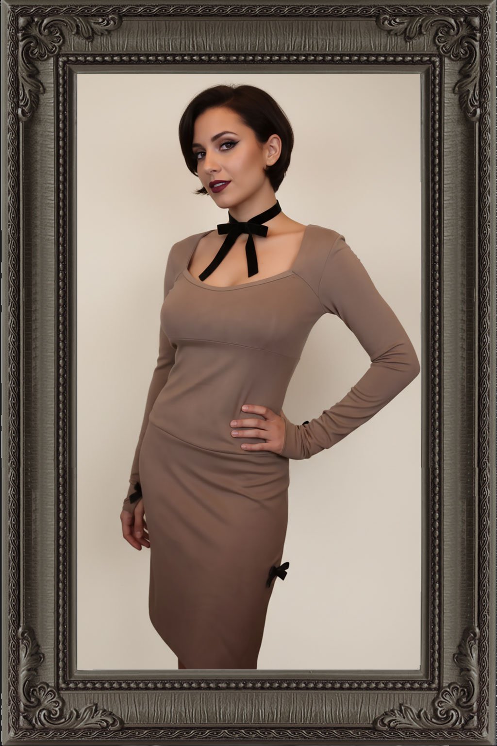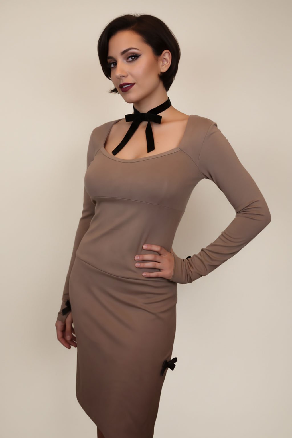 Béžové šaty z umělého elastického semiše ve velikosti S. Sukně je podšívkovaná. Materiál je velmi kvalitní, snadno se udržuje, dá se prát, nemačká se. Je pevnější, doporučuji velikost XS/S.