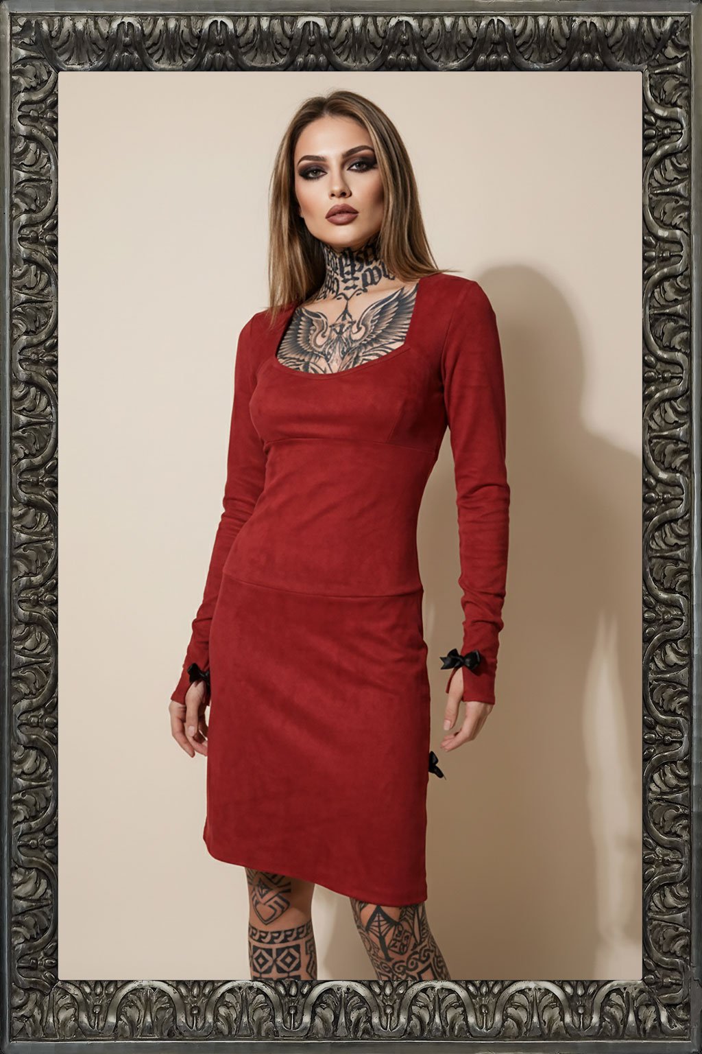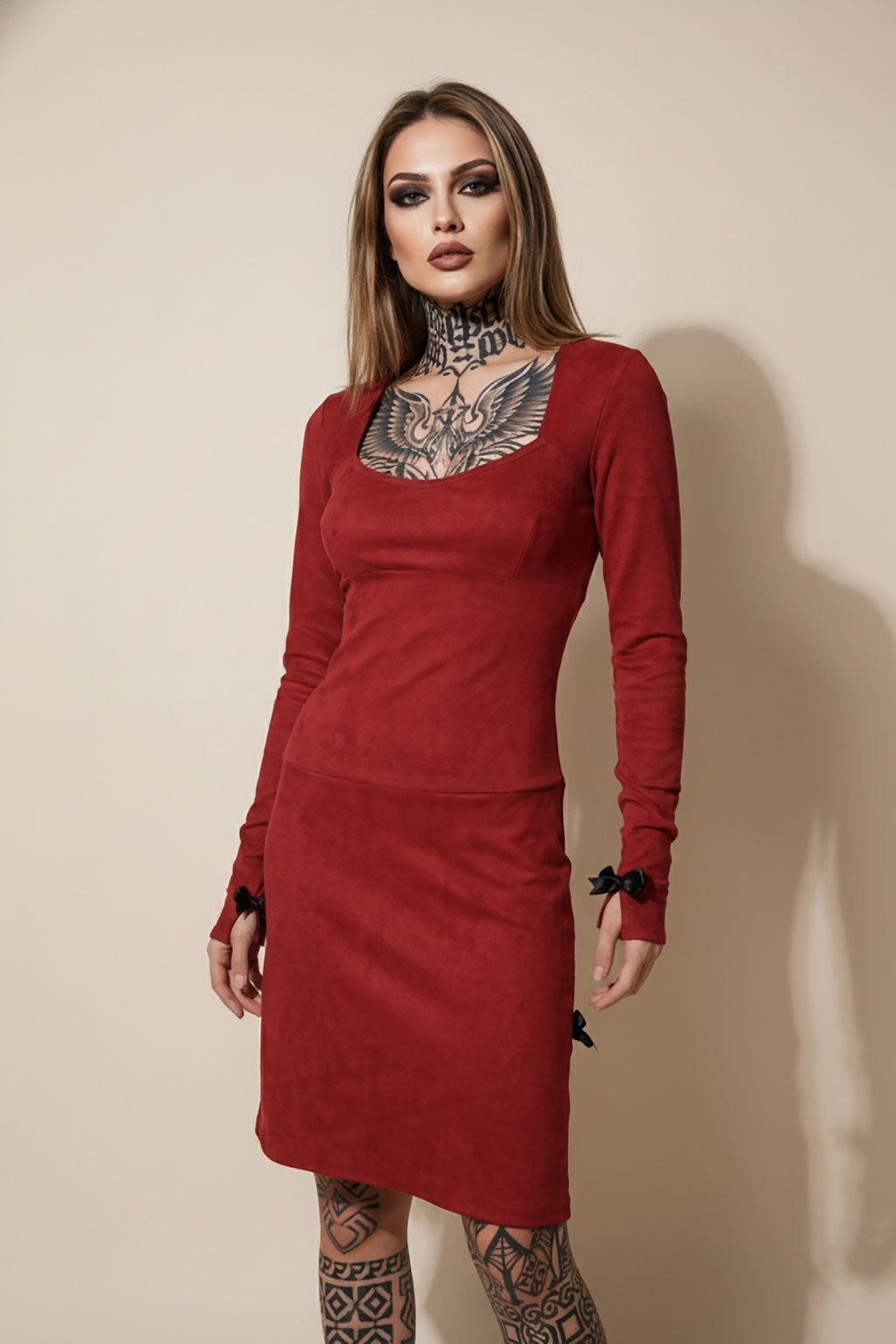 Červené šaty z umělého elastického semiše ve velikosti S. Sukně je podšívkovaná. Materiál je velmi kvalitní, snadno se udržuje, dá se prát, nemačká se. Je pevnější, doporučuji velikost XS/S.