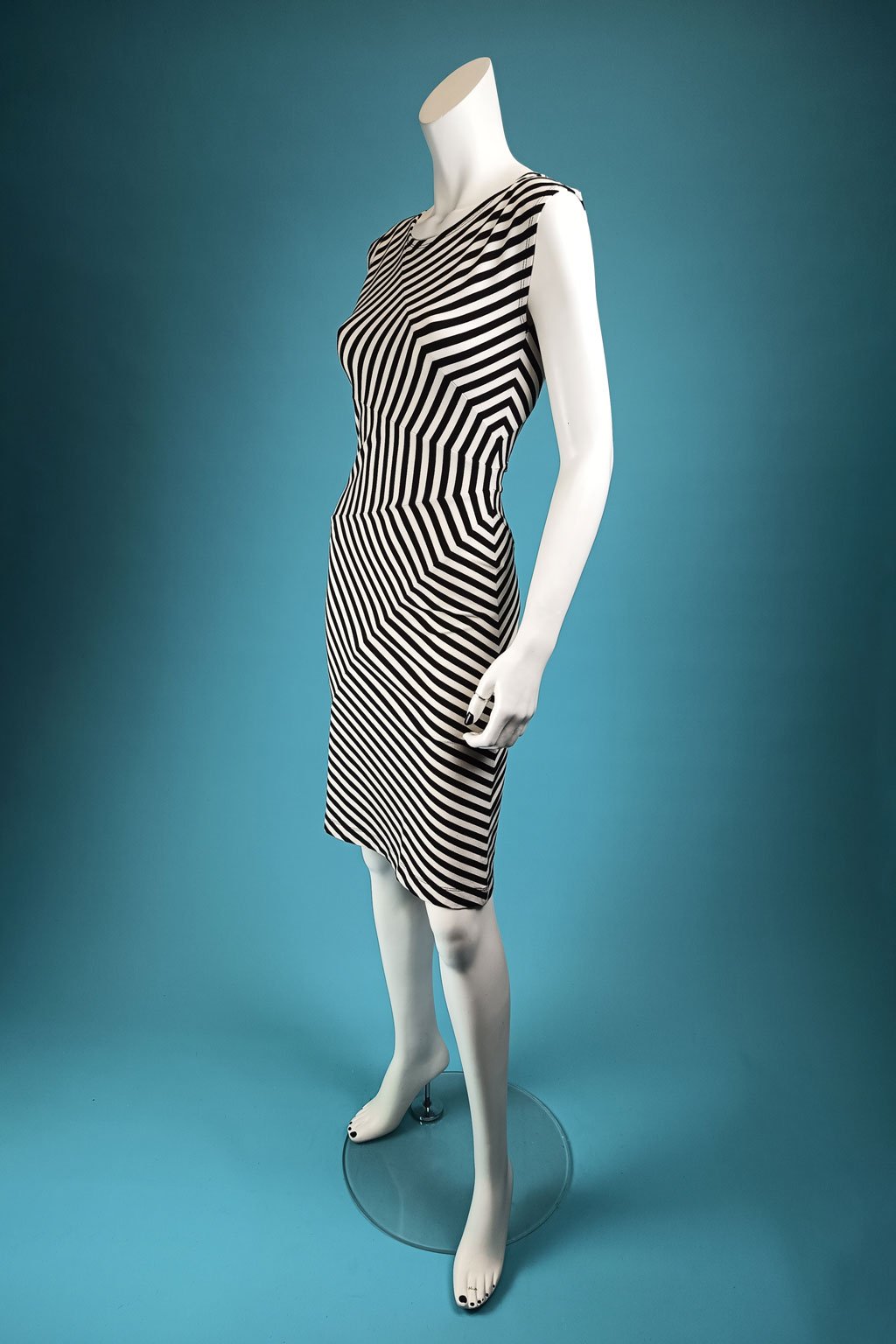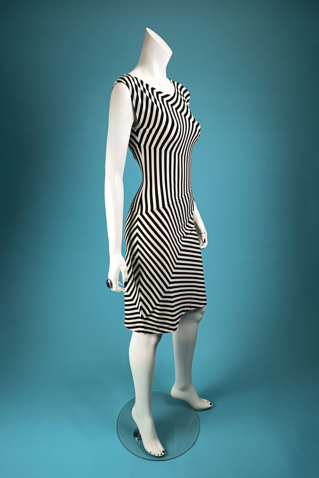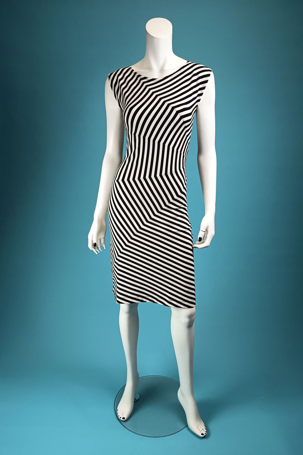 Elegantní pruhované šaty, které jsou ručně skládané do motivu oválu na levé straně. Jsou mírně rozšířené v ramenou a díky sesazení pruhů krásně tvarují pas a proto jsou vhodné i pro ženy s rovnější postavou nebo malým bříškem.